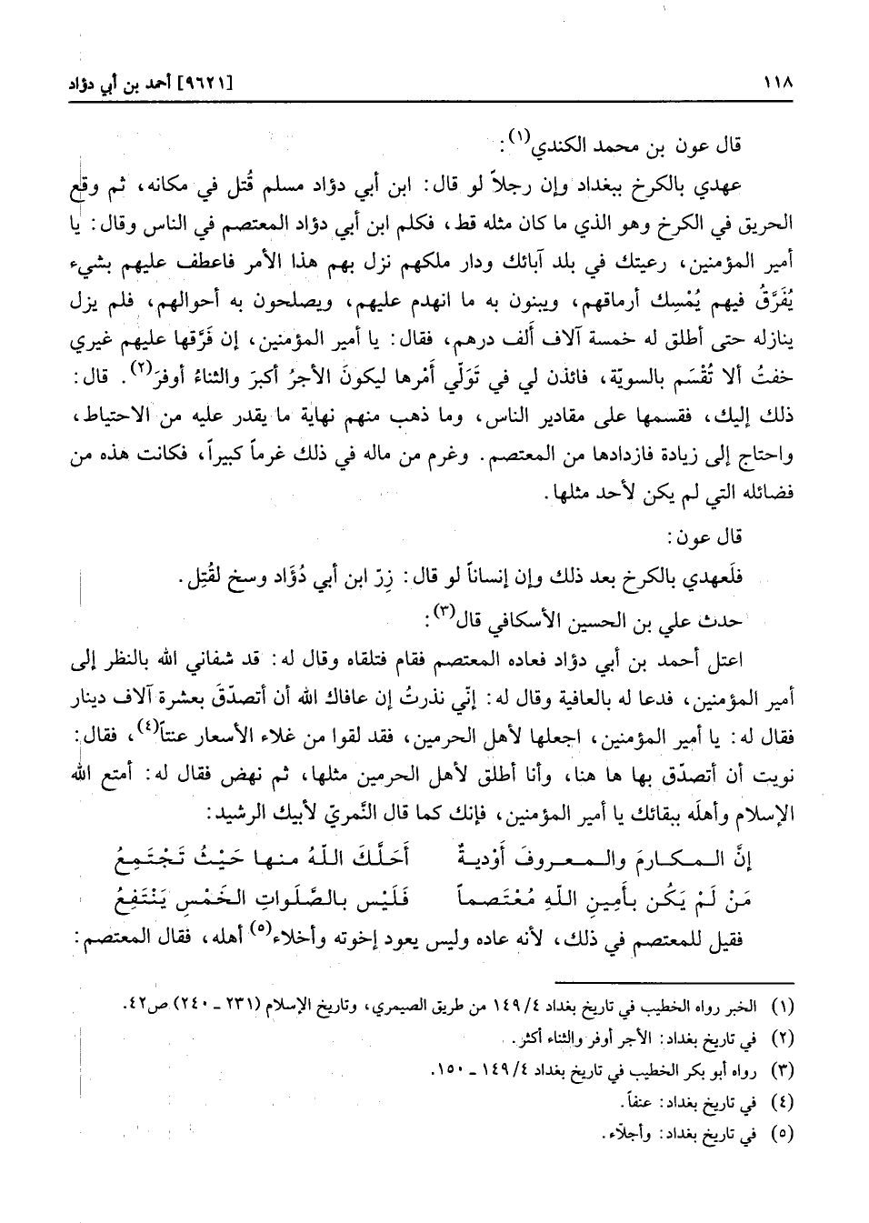 قال عون بن محمد الكندي «1» : عهدي بالكرخ ببغداد وإن رجلا لو قال: ابن أبي دؤاد مسلم قتل في مكانه، ثم وقع الحريق في الكرخ وهو الذي ما كان مثله قط، فكلم ابن أبي دؤاد المعتصم في الناس وقال: يا أمير المؤمنين، رعيتك في بلد آبائك ودار ملكهم نزل بهم هذا الأمر فاعطف عليهم بشيء يفرّق فيهم يمسك أرماقهم، ويبنون به ما انهدم عليهم، ويصلحون به أحوالهم، فلم يزل ينازله حتى أطلق له خمسة آلاف ألف درهم، فقال: يا أمير المؤمنين، إن فرّقها عليهم غيري خفت ألا تقسم بالسويّة، فائذن لي في تولّي أمرها ليكون الأجر أكبر والثناء أوفر «2» . قال: