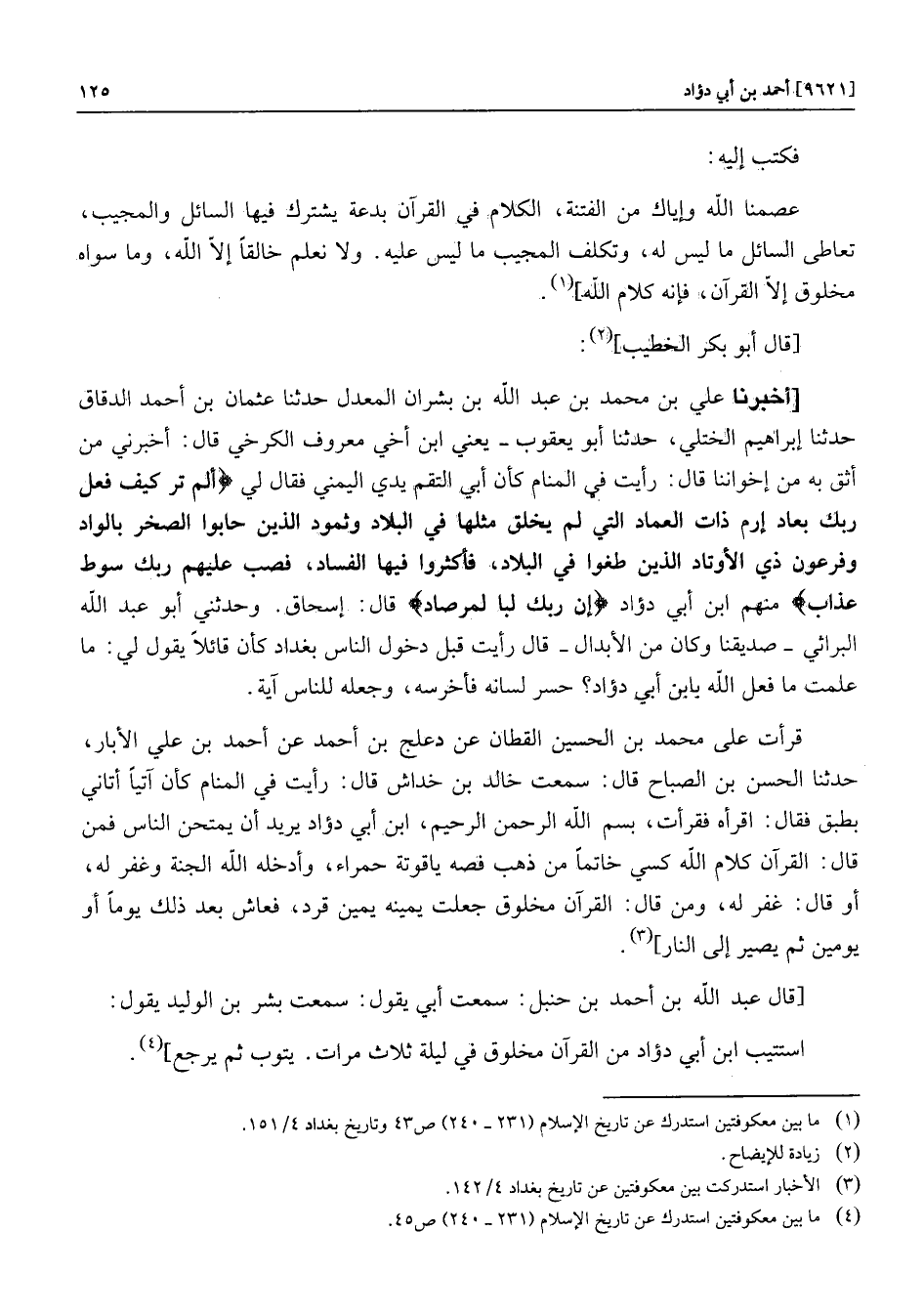 عصمنا الله وإياك من الفتنة، الكلام في القرآن بدعة يشترك فيها السائل والمجيب، تعاطى السائل ما ليس له، وتكلف المجيب ما ليس عليه. ولا نعلم خالقا إلّا الله، وما سواه مخلوق إلّا القرآن، فإنه كلام الله] «1» .