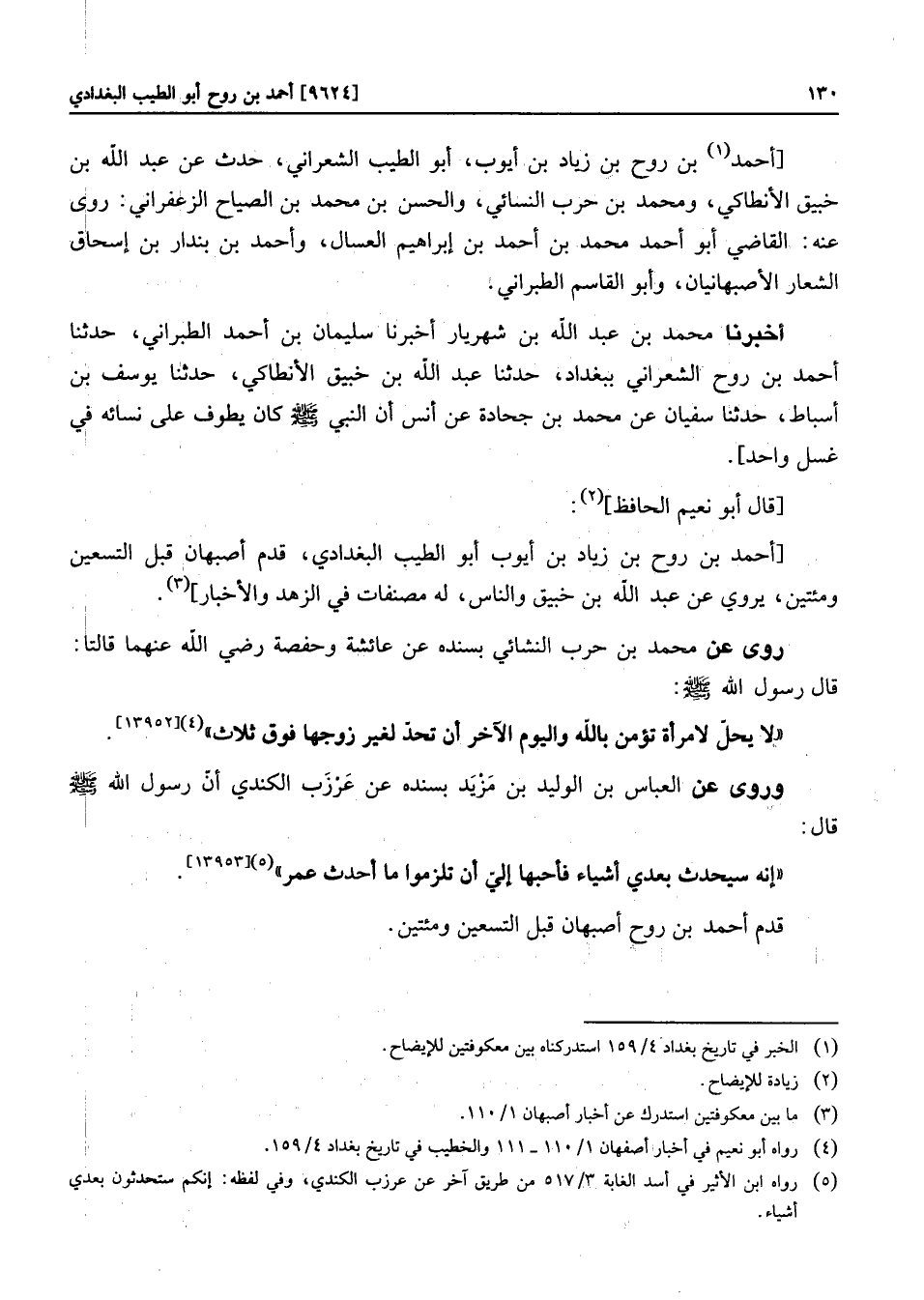 [أحمد بن روح بن زياد بن أيوب أبو الطيب البغدادي، قدم أصبهان قبل التسعين ومئتين، يروي عن عبد الله بن خبيق والناس، له مصنفات في الزهد والأخبار] «3» .