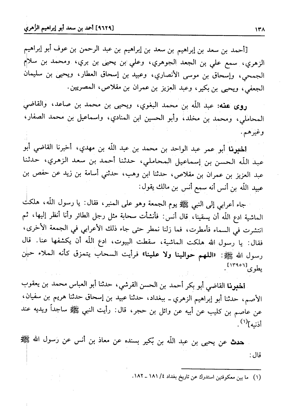 أخبرنا أبو عمر عبد الواحد بن محمد بن عبد الله بن مهدي، أخبرنا القاضي أبو عبد الله الحسن بن إسماعيل المحاملي، حدثنا أحمد بن سعد الزهري، حدثنا عبد العزيز بن عمران بن مقلاص، حدثنا ابن وهب، حدثني أسامة بن زيد عن حفص بن عبيد الله بن أنس أنه سمع أنس بن مالك يقول: