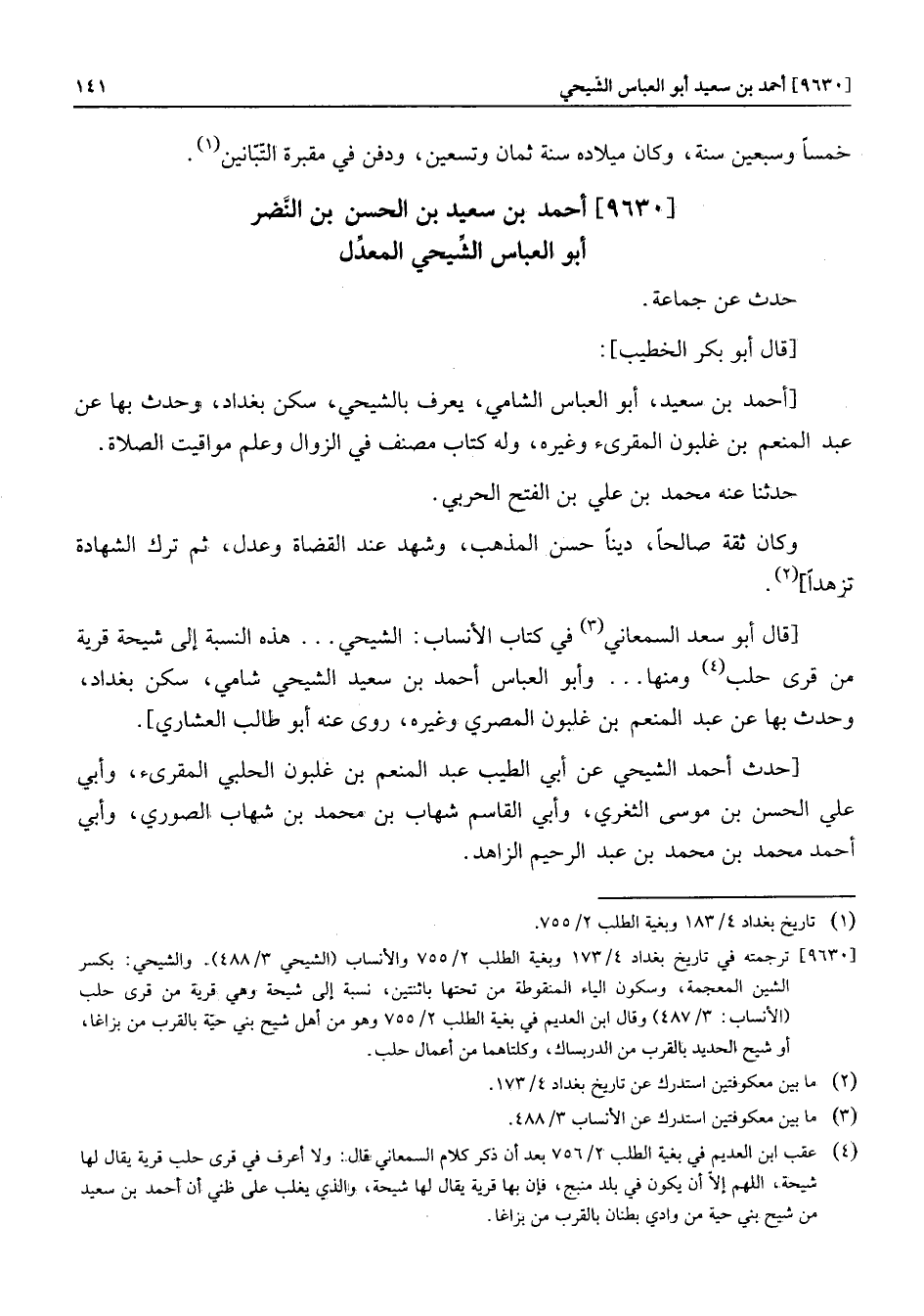 [قال أبو بكر الخطيب] : [أحمد بن سعيد، أبو العباس الشامي، يعرف بالشيحي، سكن بغداد، وحدث بها عن عبد المنعم بن غلبون المقرىء وغيره، وله كتاب مصنف في الزوال وعلم مواقيت الصلاة.