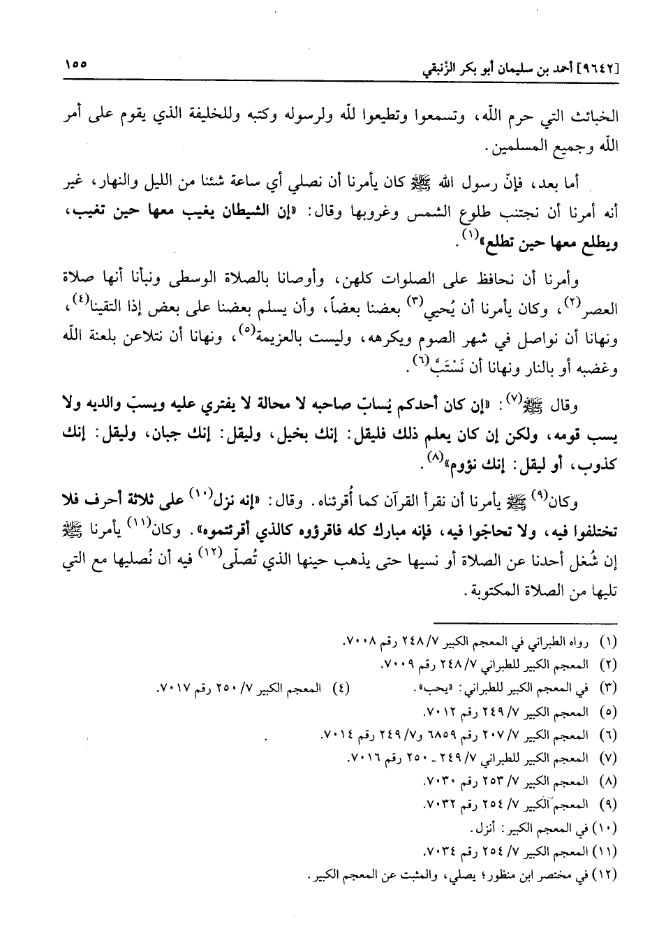 أما بعد، فإنّ رسول الله صلى الله عليه وسلم كان يأمرنا أن نصلي أي ساعة شئنا من الليل والنهار، غير أنه أمرنا أن نجتنب طلوع الشمس وغروبها وقال: «إن الشيطان يغيب معها حين تغيب، ويطلع معها حين تطلع» «1» .