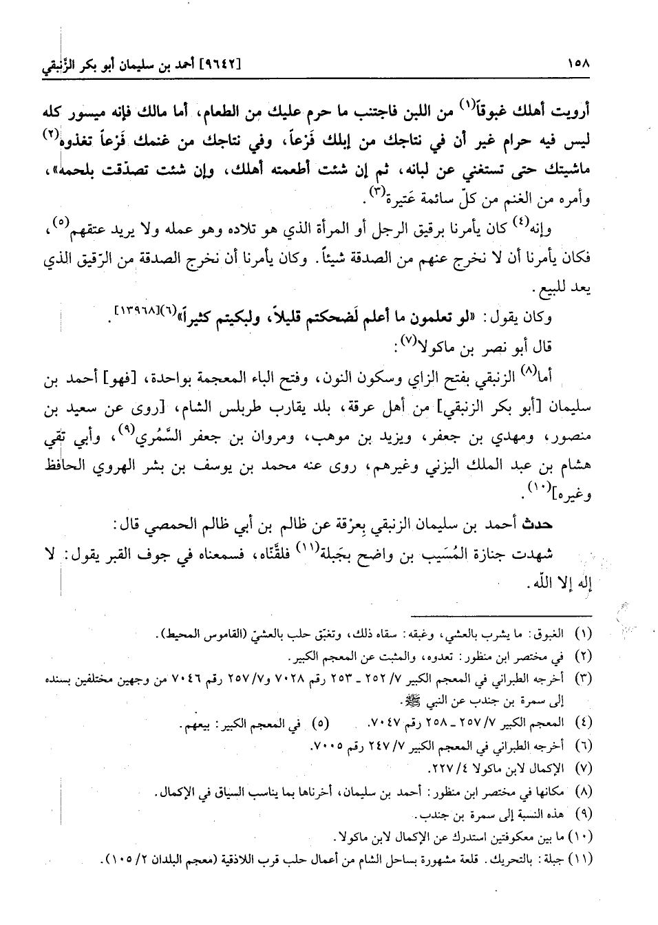 أما «8» الزنبقي بفتح الزاي وسكون النون، وفتح الباء المعجمة بواحدة، [فهو] أحمد بن سليمان [أبو بكر الزنبقي] من أهل عرقة، بلد يقارب طربلس الشام، [روى عن سعيد بن منصور، ومهدي بن جعفر، ويزيد بن موهب، ومروان بن جعفر السّمري «9» ، وأبي تقي هشام بن عبد الملك اليزني وغيرهم، روى عنه محمد بن يوسف بن بشر الهروي الحافظ وغيره] «10» .