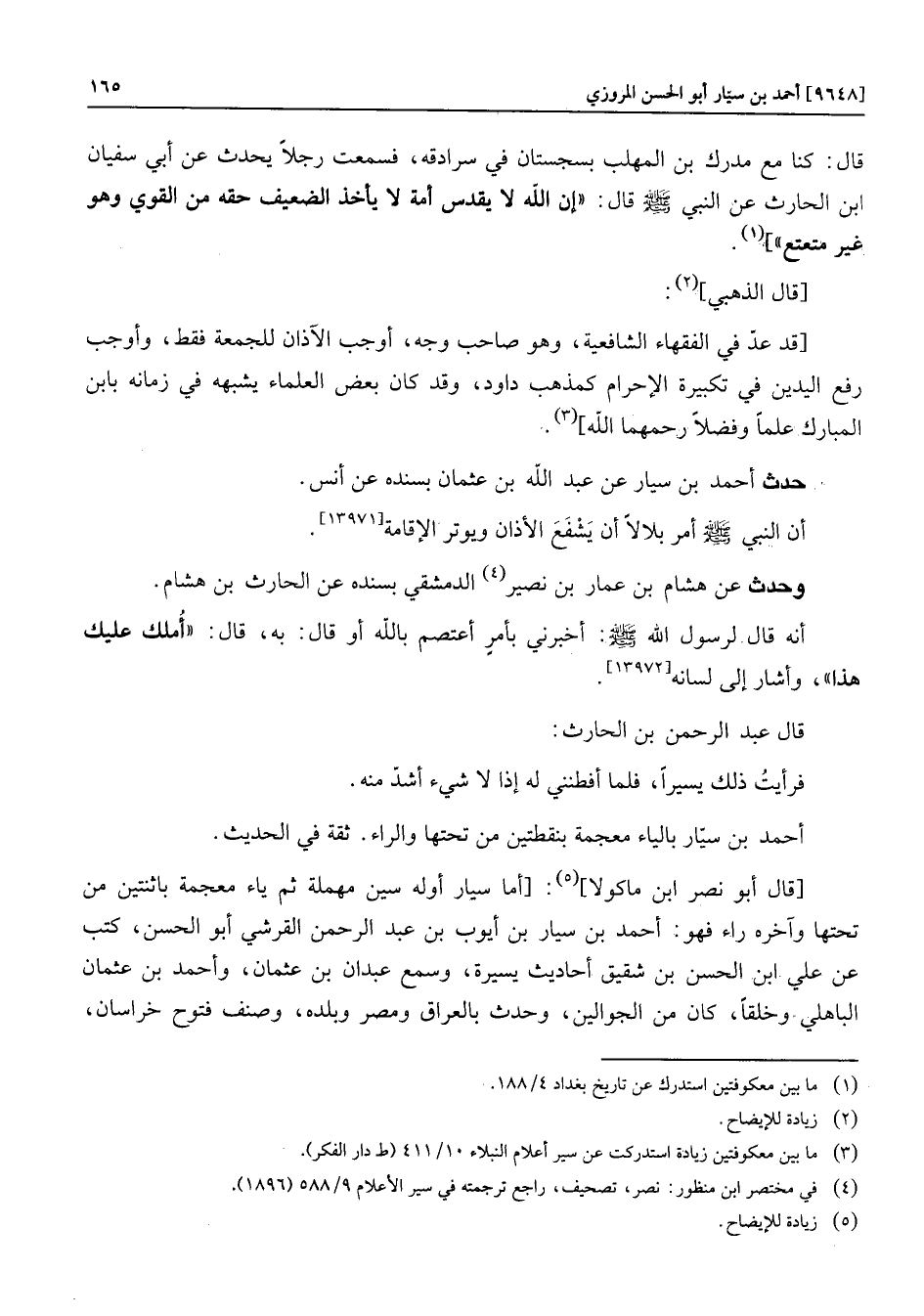 أحمد بن سيّار بالياء معجمة بنقطتين من تحتها والراء. ثقة في الحديث. [قال أبو نصر ابن ماكولا] »