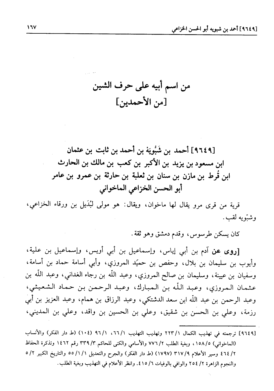 [9649] ترجمته في تهذيب الكمال 1/223 وتهذيب التهذيب 1/66، 1/96 (104) (ط دار الفكر) والأنساب (الماخواني) 5/158، وبغية الطلب 2/776 والأسامي والكنى للحاكم 3/339 رقم 1462 وتذكرة الحفاظ 2/464 وسير الأعلام 9/317 (1797) (ط دار الفكر) والجرح والتعديل 1/1/55 والتاريخ الكبير 2/5 والنجوم الزاهرة 2/254 والوافي بالوفيات 6/415. وانظر الأعلام في التهذيب وبغية الطلب.