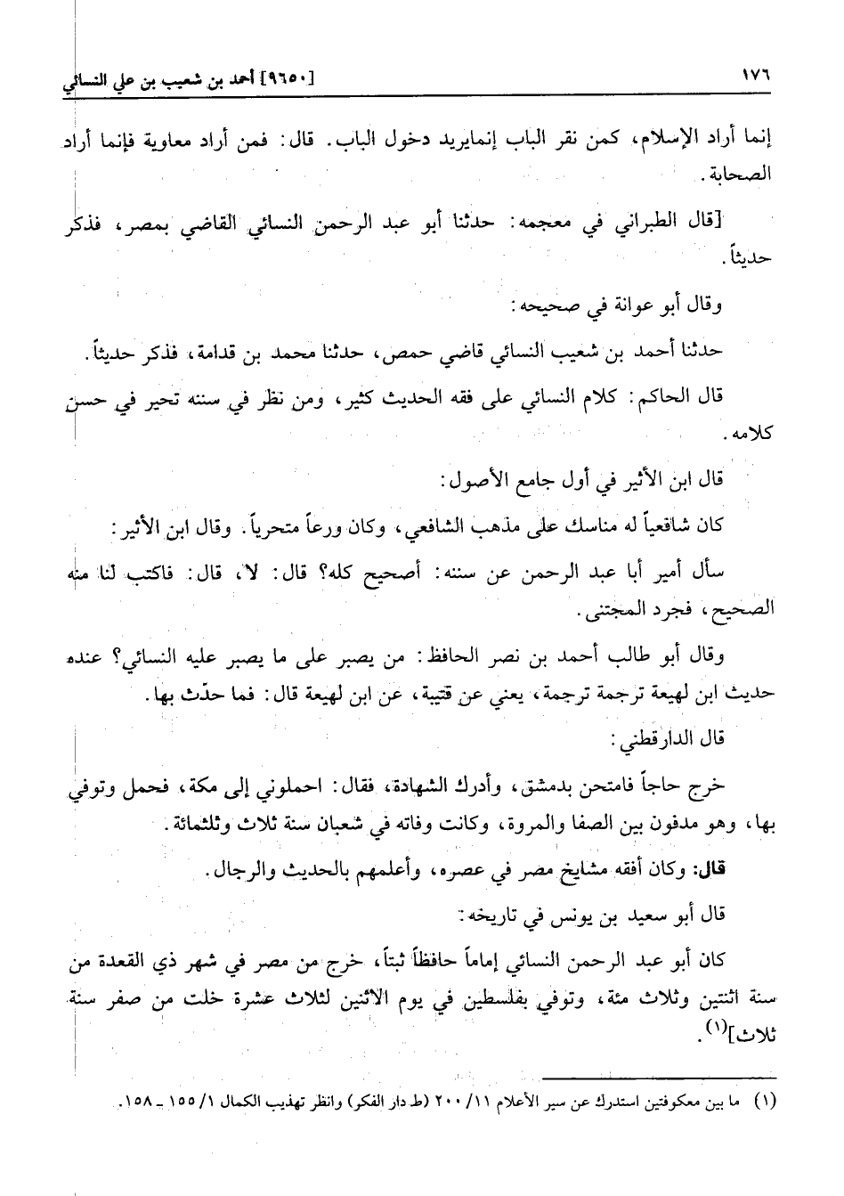 كان أبو عبد الرحمن النسائي إماما حافظا ثبتا، خرج من مصر في شهر ذي القعدة من سنة اثنتين وثلاث مئة، وتوفي بفلسطين في يوم الاثنين لثلاث عشرة خلت من صفر سنة ثلاث] «1» .