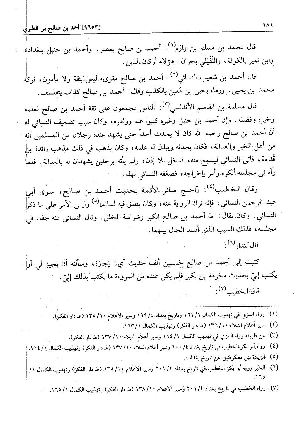 قال مسلمة بن القاسم الأندلسي «3» : الناس مجمعون على ثقة أحمد بن صالح لعلمه وخيره وفضله. وإن أحمد بن حنبل وغيره كتبوا عنه ووثقوه، وكان سبب تضعيف النسائي له أنّ أحمد بن صالح رحمه الله كان لا يحدث أحدا حتى يشهد عنده رجلان من المسلمين أنه من أهل الخير والعدالة، فكان يحدثه ويبذل له علمه، وكان يذهب في ذلك مذهب زائدة بن قدامة، فأتى النسائي ليسمع منه، فدخل بلا إذن، ولم يأته برجلين يشهدان له بالعدالة. فلما رآه في مجلسه أنكره وأمر بإخراجه، فضعّفه النسائي لهذا. وقال الخطيب «4» : [احتج سائر الأئمة بحديث أحمد بن صالح، سوى أبي عبد الرحمن النسائي، فإنه ترك الرواية عنه، وكان يطلق فيه لسانه] «5» وليس الأمر على ما ذكر النسائي. وكان يقال: آفة أحمد بن صالح الكبر وشراسة الخلق. ونال النسائي منه جفاء في مجلسه، فذلك السبب الذي أفسد الحال بينهما.