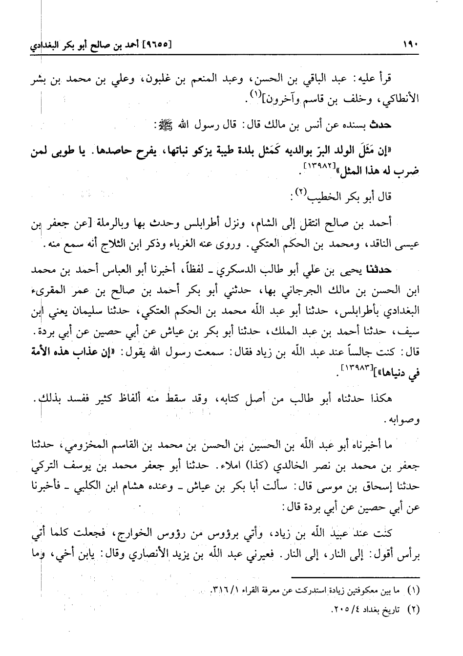 ما أخبرناه أبو عبد الله بن الحسين بن الحسن بن محمد بن القاسم المخزومي، حدثنا جعفر بن محمد بن نصر الخالدي (كذا) املاء. حدثنا أبو جعفر محمد بن يوسف التركي حدثنا إسحاق بن موسى قال: سألت أبا بكر بن عياش- وعنده هشام ابن الكلبي- فأخبرنا عن أبي حصين عن أبي بردة قال: