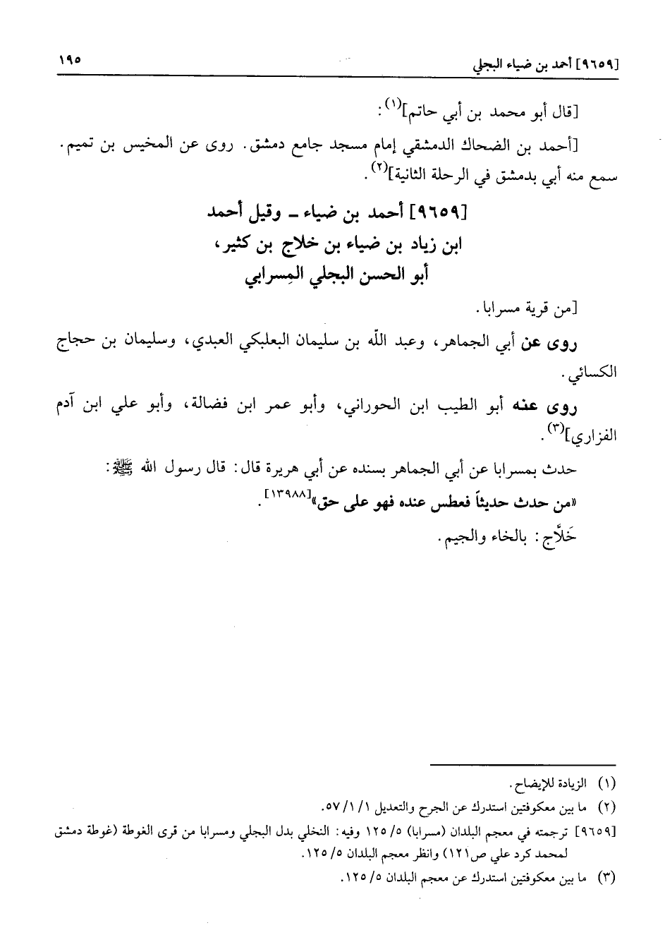 [9659] ترجمته في معجم البلدان (مسرابا) 5/125 وفيه: النخلي بدل البجلي ومسرابا من قرى الغوطة (غوطة دمشق لمحمد كرد علي ص 121) وانظر معجم البلدان 5/125.