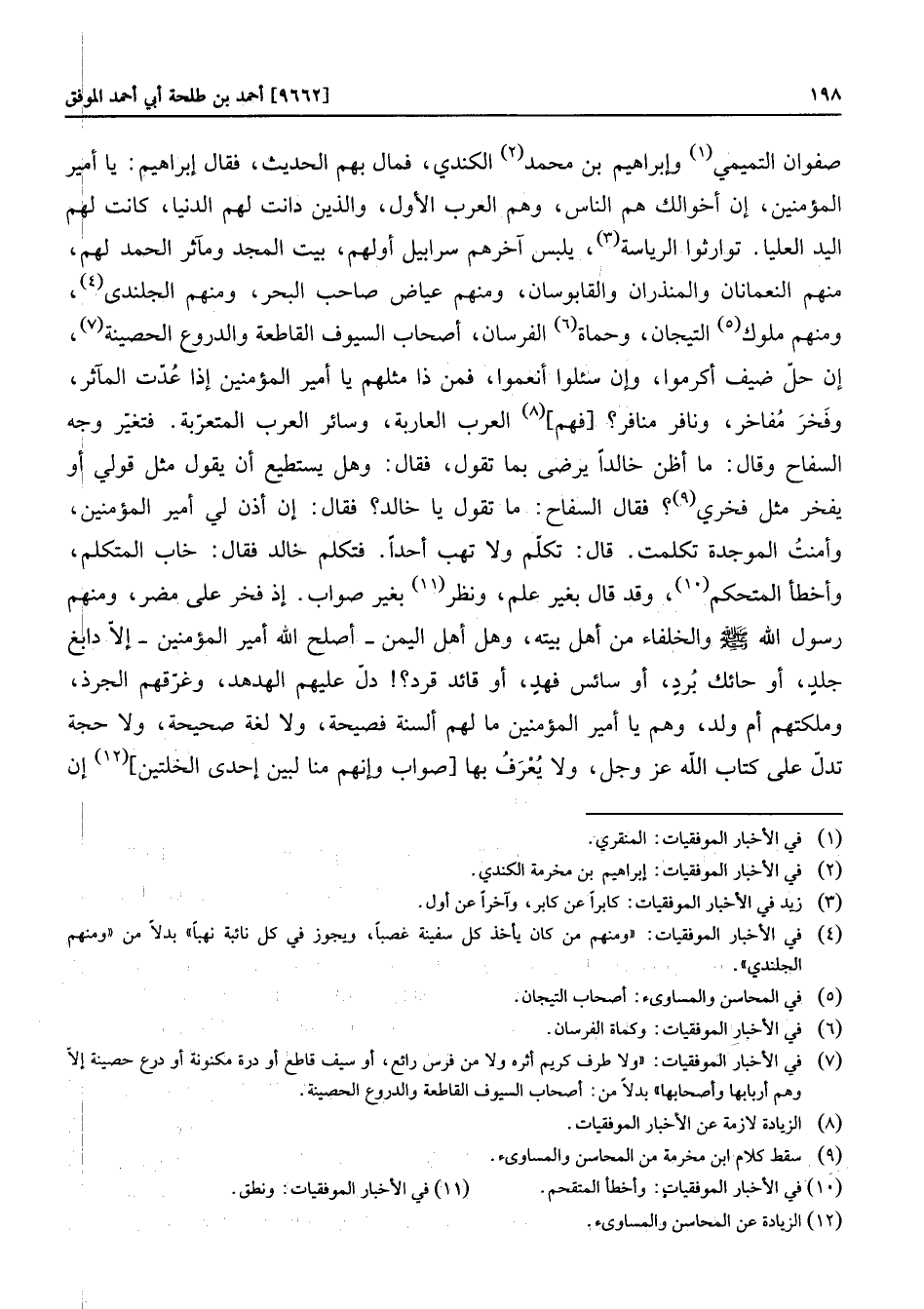 صفوان التميمي «1» وإبراهيم بن محمد «2» الكندي، فمال بهم الحديث، فقال إبراهيم: يا أمير المؤمنين، إن أخوالك هم الناس، وهم العرب الأول، والذين دانت لهم الدنيا، كانت لهم اليد العليا. توارثوا الرياسة «3» ، يلبس آخرهم سرابيل أولهم، بيت المجد ومآثر الحمد لهم، منهم النعمانان والمنذران والقابوسان، ومنهم عياض صاحب البحر، ومنهم الجلندى «4» ، ومنهم ملوك «5» التيجان، وحماة «6» الفرسان، أصحاب السيوف القاطعة والدروع الحصينة «7» ، إن حلّ ضيف أكرموا، وإن سئلوا أنعموا، فمن ذا مثلهم يا أمير المؤمنين إذا عدّت المآثر، وفخر مفاخر، ونافر منافر؟ [فهم] «8» العرب العاربة، وسائر العرب المتعرّبة. فتغيّر وجه السفاح وقال: ما أظن خالدا يرضى بما تقول، فقال: وهل يستطيع أن يقول مثل قولي أو يفخر مثل فخري «9» ؟ فقال السفاح: ما تقول يا خالد؟ فقال: إن أذن لي أمير المؤمنين، وأمنت الموجدة تكلمت. قال: تكلّم ولا تهب أحدا. فتكلم خالد فقال: خاب المتكلم، وأخطأ المتحكم «10» ، وقد قال بغير علم، ونظر «11» بغير صواب. إذ فخر على مضر، ومنهم رسول الله صلى الله عليه وسلم والخلفاء من أهل بيته، وهل أهل اليمن- أصلح الله أمير المؤمنين- إلّا دابغ جلد، أو حائك برد، أو سائس فهد، أو قائد قرد؟! دلّ عليهم الهدهد، وغرّقهم الجرذ، وملكتهم أم ولد، وهم يا أمير المؤمنين ما لهم ألسنة فصيحة، ولا لغة صحيحة، ولا حجة تدلّ على كتاب الله عز وجل، ولا يعرف بها [صواب وإنهم منا لبين إحدى الخلتين] «12» إن