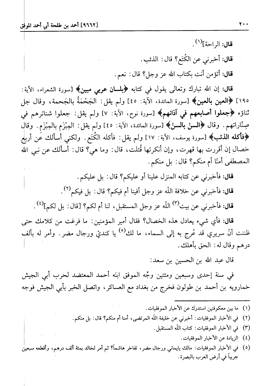 [سورة يوسف، الآية: 17] ولم يقل: فأكله الكتع. ولكني أسألكعن أربع خصال إن أقررت بها قهرت، وإن أنكرتها قتلت، قال: وما هي؟ قال: أسألك عن نبي الله المصطفى أمنّا أم منكم؟ قال: بل منكم.