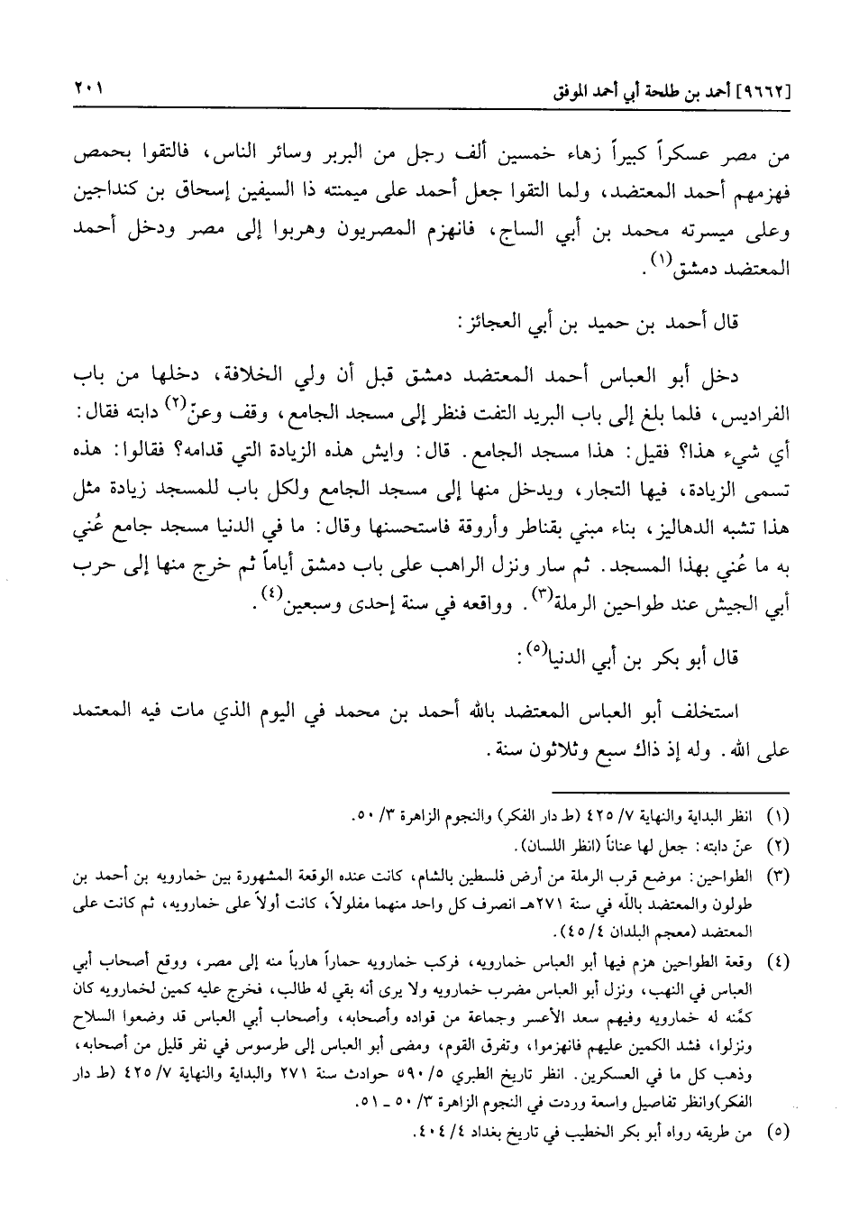 من مصر عسكرا كبيرا زهاء خمسين ألف رجل من البربر وسائر الناس، فالتقوا بحمص فهزمهم أحمد المعتضد، ولما التقوا جعل أحمد على ميمنته ذا السيفين إسحاق بن كنداجين وعلى ميسرته محمد بن أبي الساج، فانهزم المصريون وهربوا إلى مصر ودخل أحمد المعتضد دمشق «1» .