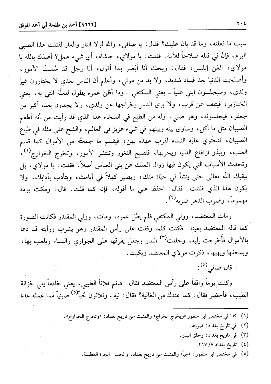 سبب ما فعلته، وما قد بان عليك؟ فقال: يا صافي، والله لولا النار والعار لقتلت هذا الصبي اليوم، فإنّ في قتله صلاحا للأمة. فقلت: يا مولاي، حاشاه، أي شيء عمل؟ أعيذك بالله يا مولاي، العن إبليس، فقال: ويحك أنا أبصر بما أقول، أنا رجل قد سست الأمور، وأصلحت الدنيا بعد فساد شديد، ولا بد من موتي، وأعلم أن الناس بعدي لا يختارون غير ولدي، وسيجلسون ابني عليا- يعني المكتفي- وما أظن عمره يطول للعلّة التي به، يعني الخنازير، فيتلف عن قرب، ولا يرى الناس إخراجها عن ولدي، ولا يجدون بعده أكبر من جعفر، فيجلسونه، وهو صبي، وله من الطبع في السخاء هذا الذي قد رأيت من أنه أطعم الصبيان مثل ما أكل، وساوى بينه وبينهم في شيء عزيز في العالم، والشح على مثله في طباع الصبيان، فتحتوي عليه النساء لقرب عهده بهن، فيقسم ما جمعته من الأموال كما قسم العنب، ويبذر ارتفاع الدنيا ويخربها، فتضيع الثغور وتنتشر الأمور، وتخرج الخوارج «1» ، وتحدث الأسباب التي يكون فيها زوال الملك عن بني العباس أصلا. فقلت: يا مولاي، بل يبقيك الله تعالى حتى ينشأ في حياة منك، ويصير كهلا في أيامك، ويتأدب بآدابك، ولا يكون هذا الذي ظننت. فقال: احفظ عني ما أقوله، فإنه كما قلت. قال: ومكث يومه مهموما، وضرب الدهر ضربه «2» .