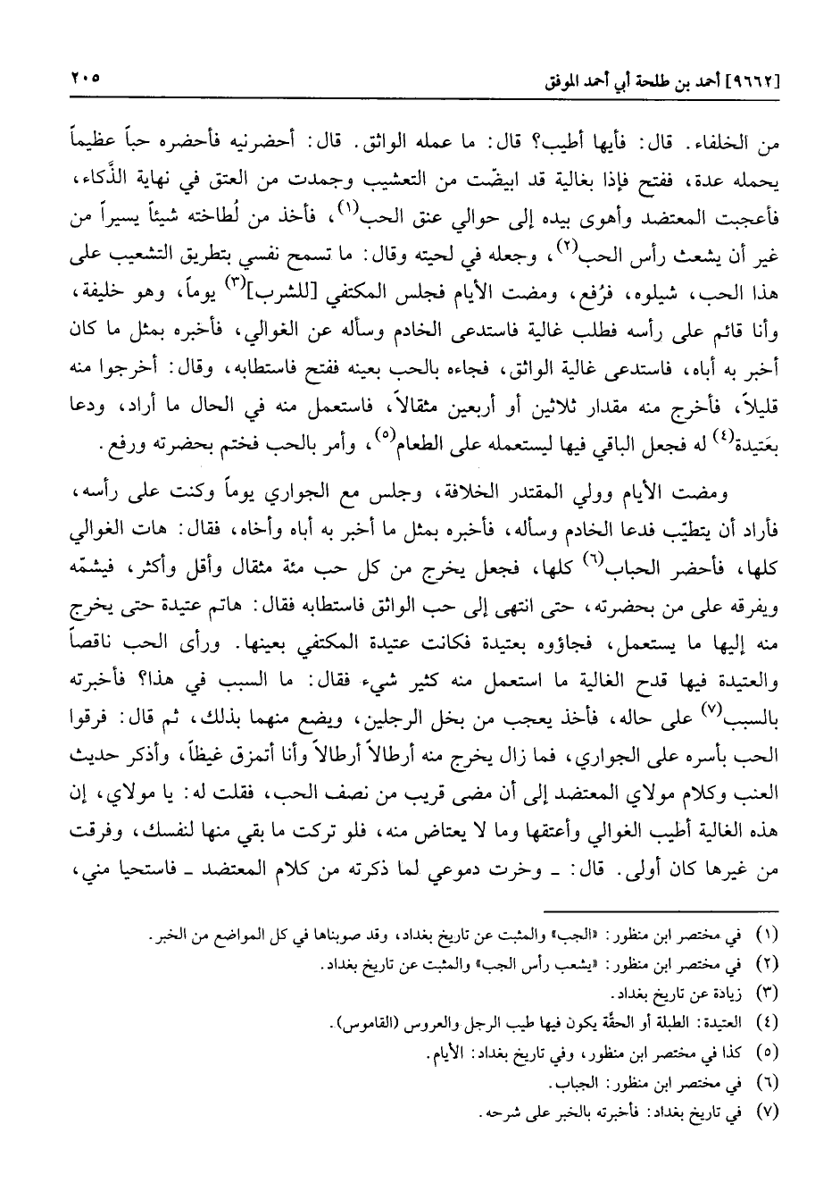 ومضت الأيام وولي المقتدر الخلافة، وجلس مع الجواري يوما وكنت على رأسه، فأراد أن يتطيّب فدعا الخادم وسأله، فأخبره بمثل ما أخبر به أباه وأخاه، فقال: هات الغوالي كلها، فأحضر الحباب «6» كلها، فجعل يخرج من كل حب مئة مثقال وأقل وأكثر، فيشمّه ويفرقه على من بحضرته، حتى انتهى إلى حب الواثق فاستطابه فقال: هاتم عتيدة حتى يخرج منه إليها ما يستعمل، فجاؤوه بعتيدة فكانت عتيدة المكتفي بعينها. ورأى الحب ناقصا والعتيدة فيها قدح الغالية ما استعمل منه كثير شيء فقال: ما السبب في هذا؟ فأخبرته بالسبب «7» على حاله، فأخذ يعجب من بخل الرجلين، ويضع منهما بذلك، ثم قال: فرقوا الحب بأسره على الجواري، فما زال يخرج منه أرطالا أرطالا وأنا أتمزق غيظا، وأذكر حديث العنب وكلام مولاي المعتضد إلى أن مضى قريب من نصف الحب، فقلت له: يا مولاي، إن هذه الغالية أطيب الغوالي وأعتقها وما لا يعتاض منه، فلو تركت ما بقي منها لنفسك، وفرقت من غيرها كان أولى. قال: - وخرت دموعي لما ذكرته من كلام المعتضد- فاستحيا مني،