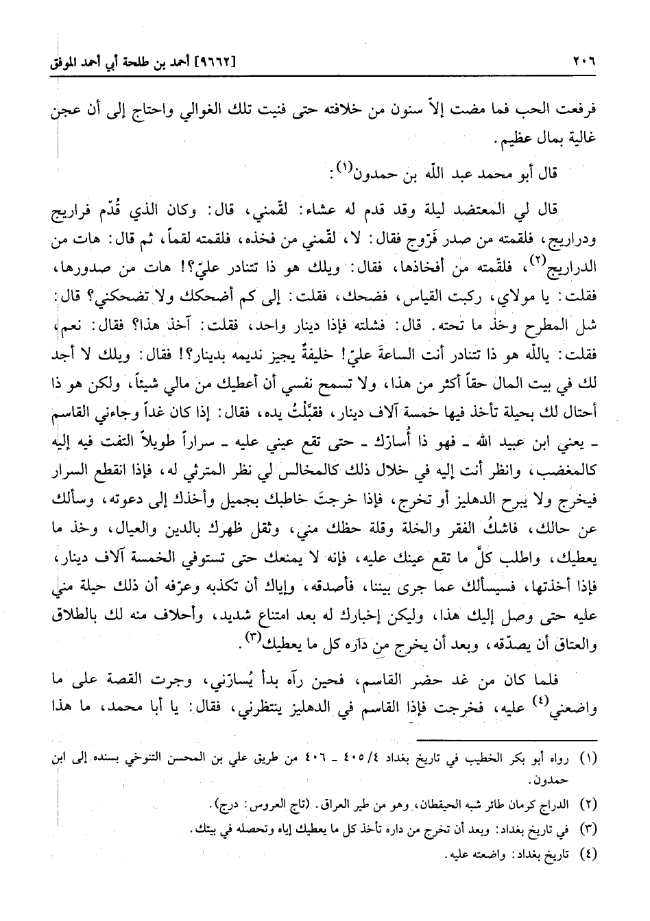 قال أبو محمد عبد الله بن حمدون «1» : قال لي المعتضد ليلة وقد قدم له عشاء: لقّمني، قال: وكان الذي قدّم فراريج ودراريج، فلقمته من صدر فرّوج فقال: لا، لقّمني من فخذه، فلقمته لقما، ثم قال: هات من الدراريج «2» ، فلقّمته من أفخاذها، فقال: ويلك هو ذا تتنادر عليّ؟! هات من صدورها، فقلت: يا مولاي، ركبت القياس، فضحك، فقلت: إلى كم أضحكك ولا تضحكني؟ قال: