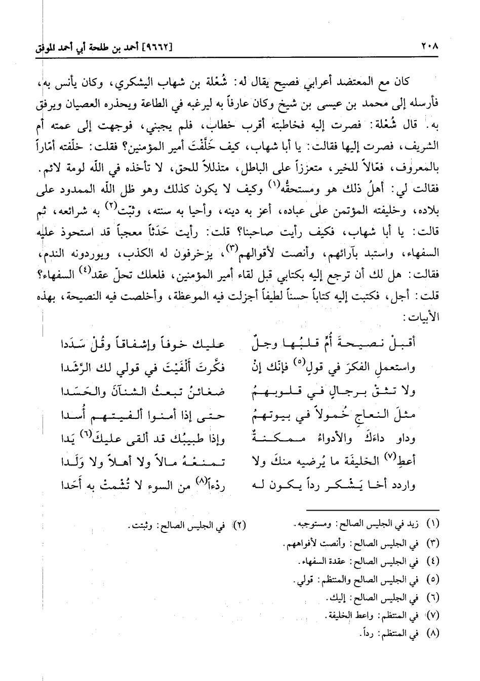 أعط «7» الخليفة ما يرضيه منك ولا تمنعه مالا ولا أهلا ولا ولداواردد أخا يشكر ردا يكون له ردءا «8» من السوء لا تشمت به أحدا