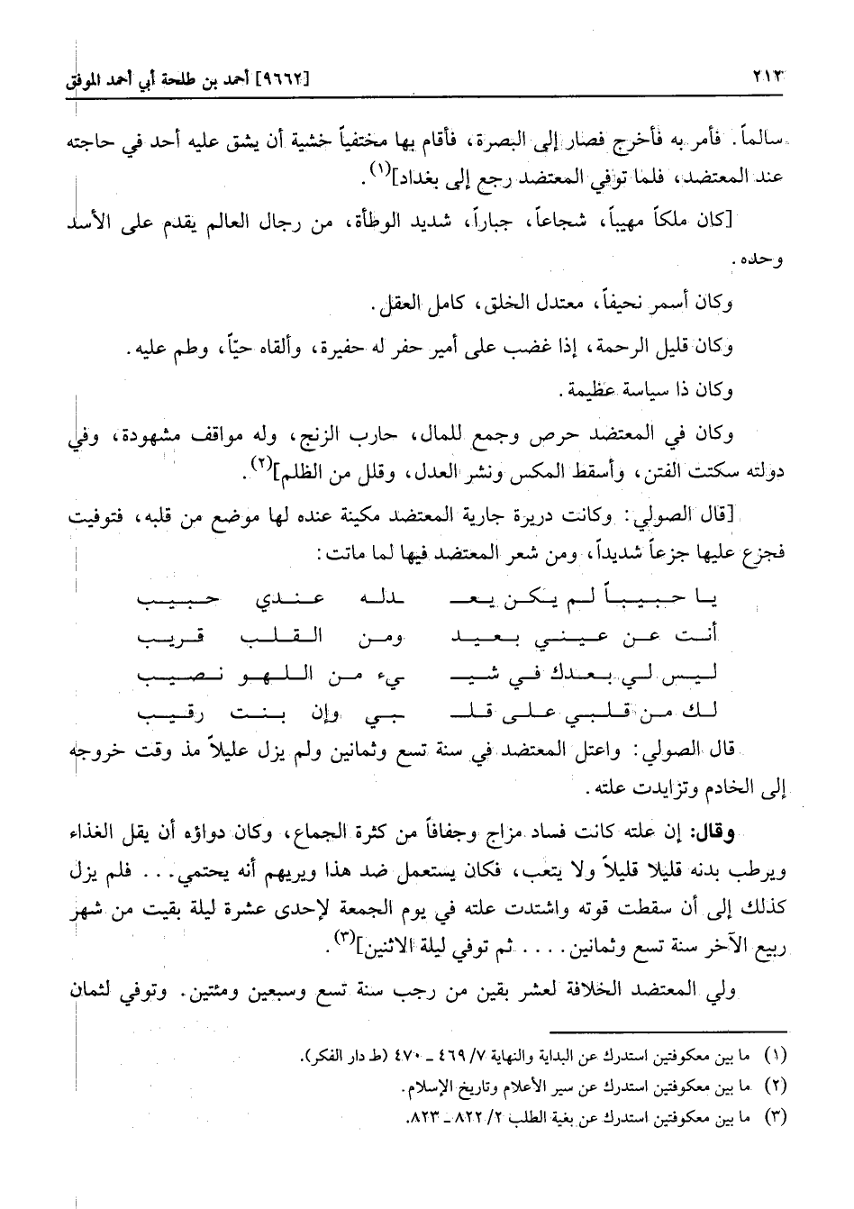 وكان في المعتضد حرص وجمع للمال، حارب الزنج، وله مواقف مشهودة، وفي دولته سكتت الفتن، وأسقط المكس ونشر العدل، وقلل من الظلم] «2» .
