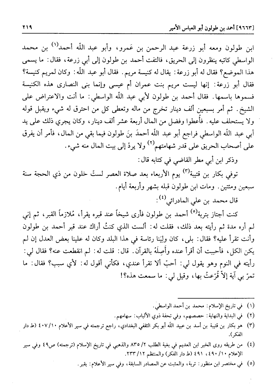 ابن طولون ومعه أبو زرعة عبد الرحمن بن عمرو، وأبو عبد الله أحمد «1» بن محمد الواسطي كاتبه ينظرون إلى الحريق، فالتفت أحمد بن طولون إلى أبي زرعة، فقال: ما يسمى هذا الموضع؟ فقال له أبو زرعة: يقال له كنيسة مريم. فقال أبو عبد الله: وكان لمريم كنيسة؟ فقال أبو زرعة: إنها ليست مريم بنت عمران أم عيسى وإنما بنى النصارى هذه الكنيسة فسموها باسمها. فقال أحمد بن طولون لأبي عبد الله الواسطي: ما أنت والاعتراض على الشيخ. ثم أمر بسبعين ألف دينار تخرج من ماله وتعطى كل من احترق له شيء ويقبل قوله ولا يستحلف عليه. فأعطوا وفضل من المال أربعة عشر ألف دينار، وكان يجري ذلك على يد أبي عبد الله الواسطي فراجع أبو عبد الله أحمد بن طولون فيما بقي من المال، فأمر أن يفرق على أصحاب الحريق على قدر شهامتهم «2» ولا يردّ إلى بيت المال منه شيء.