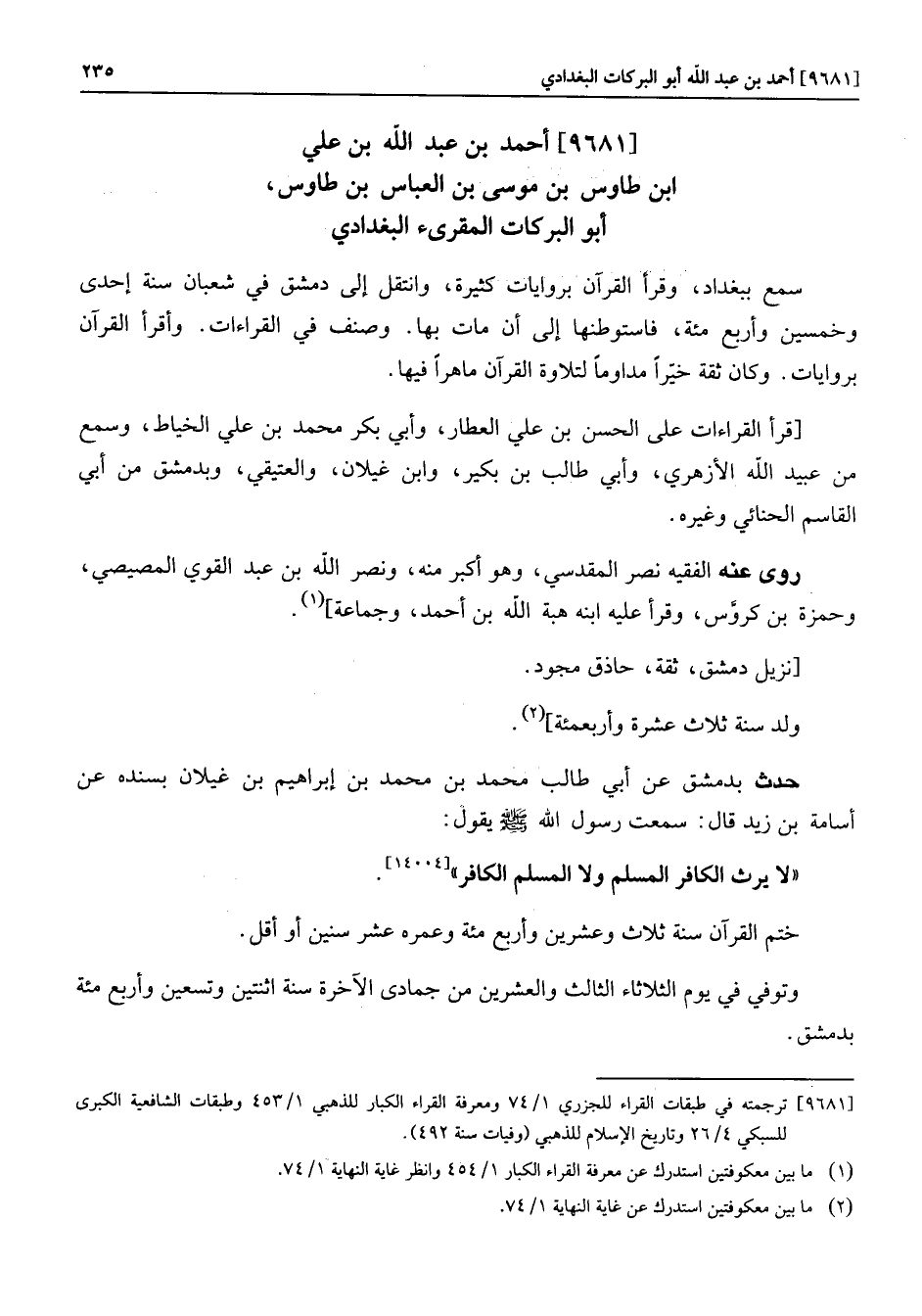 [9681] أحمد بن عبد الله بن علي ابن طاوس بن موسى بن العباس بن طاوس، أبو البركات المقرىء البغدادي