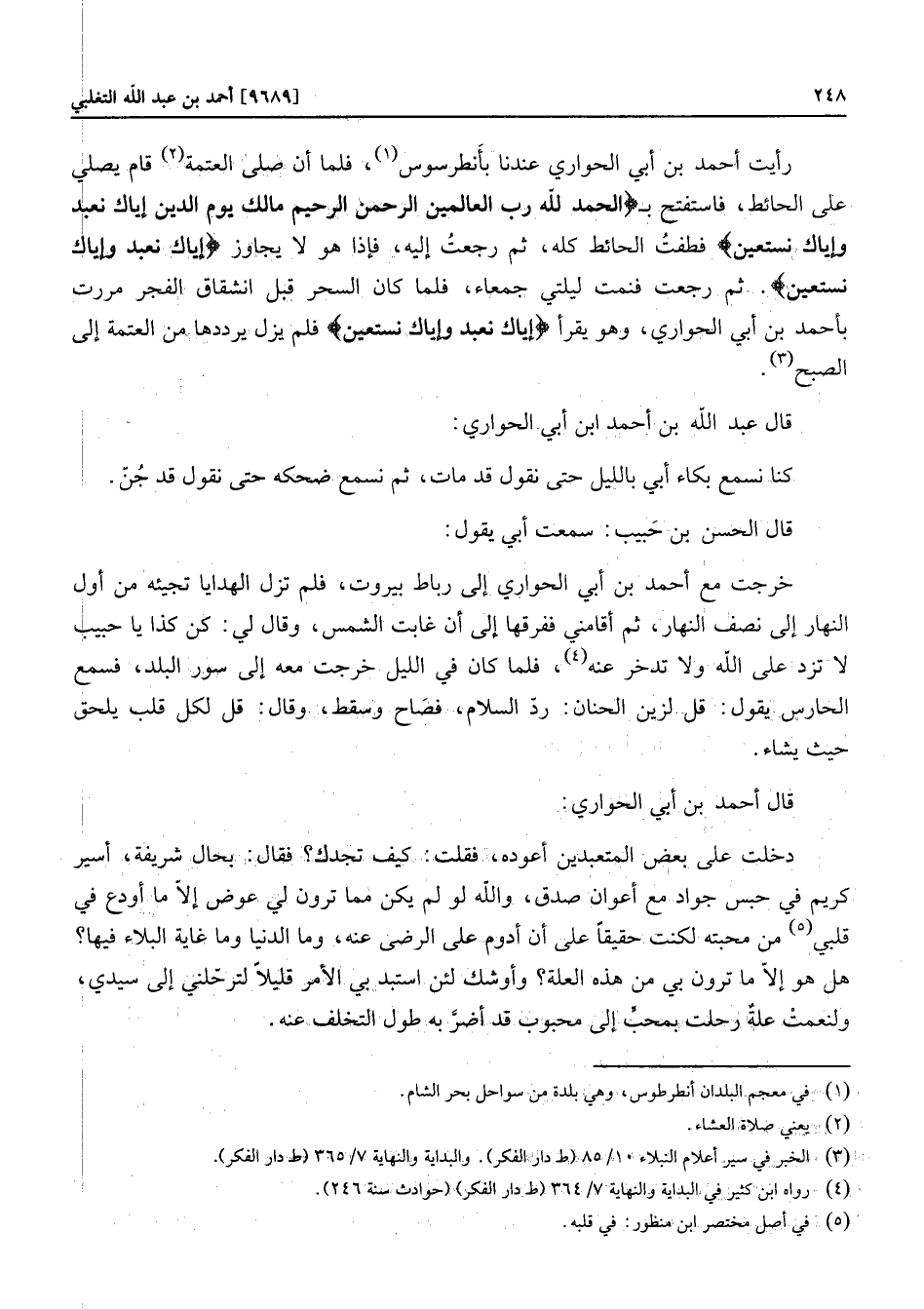 رأيت أحمد بن أبي الحواري عندنا بأنطرسوس «1» ، فلما أن صلى العتمة «2» قام يصلي على الحائط، فاستفتح ب الْحَمْدُ لِلَّهِ رَبِّ الْعالَمِينَ الرَّحْمنِ الرَّحِيمِ مالِكِ يَوْمِ الدِّينِ إِيَّاكَ نَعْبُدُ وَإِيَّاكَ نَسْتَعِينُفطفت الحائط كله، ثم رجعت إليه، فإذا هو لا يجاوز إِيَّاكَ نَعْبُدُ وَإِيَّاكَ نَسْتَعِينُ