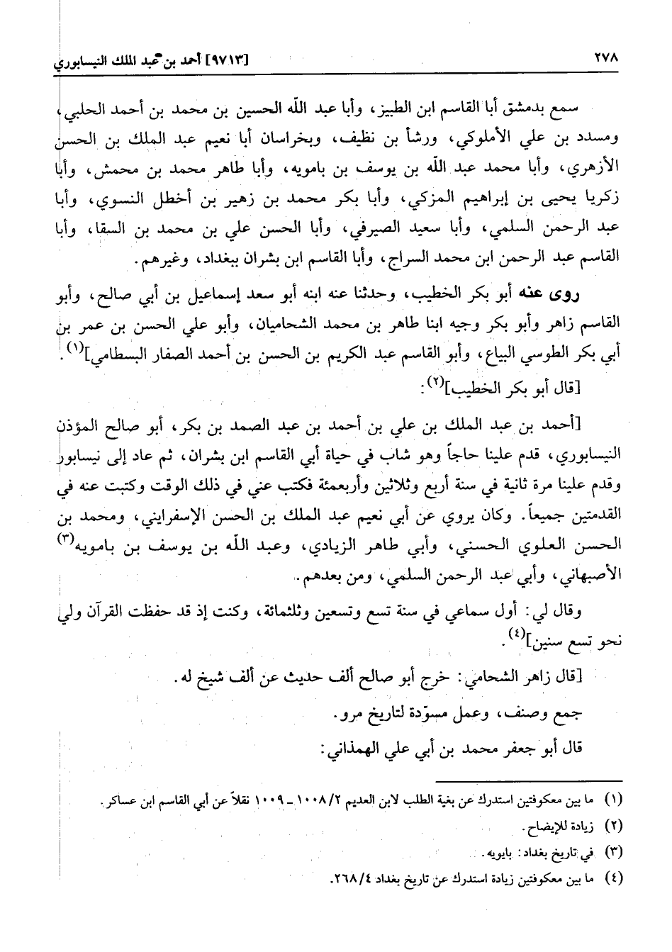 [أحمد بن عبد الملك بن علي بن أحمد بن عبد الصمد بن بكر، أبو صالح المؤذن النيسابوري، قدم علينا حاجا وهو شاب في حياة أبي القاسم ابن بشران، ثم عاد إلى نيسابور وقدم علينا مرة ثانية في سنة أربع وثلاثين وأربعمئة فكتب عني في ذلك الوقت وكتبت عنه في القدمتين جميعا. وكان يروي عن أبي نعيم عبد الملك بن الحسن الإسفرايني، ومحمد بن الحسن العلوي الحسني، وأبي طاهر الزيادي، وعبد الله بن يوسف بن بامويه «3» الأصبهاني، وأبي عبد الرحمن السلمي، ومن بعدهم.