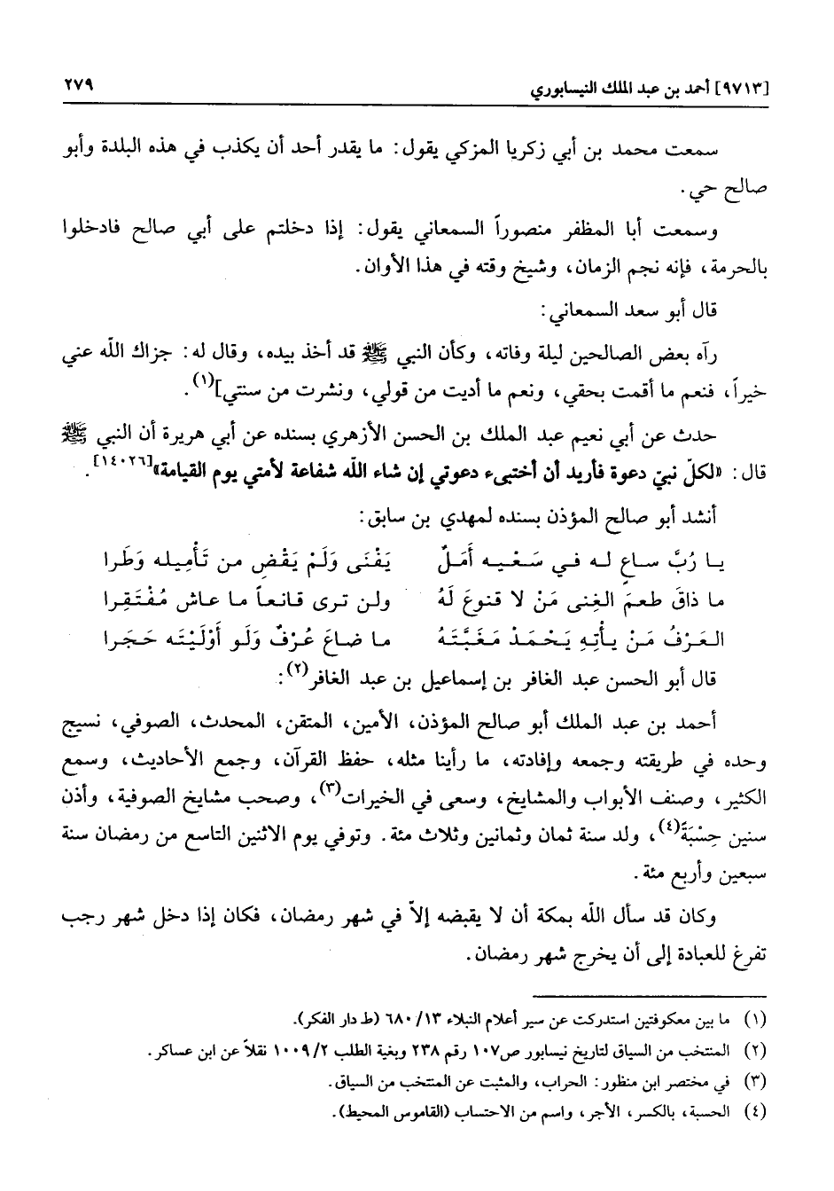 أحمد بن عبد الملك أبو صالح المؤذن، الأمين، المتقن، المحدث، الصوفي، نسيج وحده في طريقته وجمعه وإفادته، ما رأينا مثله، حفظ القرآن، وجمع الأحاديث، وسمع الكثير، وصنف الأبواب والمشايخ، وسعى في الخيرات «3» ، وصحب مشايخ الصوفية، وأذن سنين حسبة «4» ، ولد سنة ثمان وثمانين وثلاث مئة. وتوفي يوم الاثنين التاسع من رمضان سنة سبعين وأربع مئة.