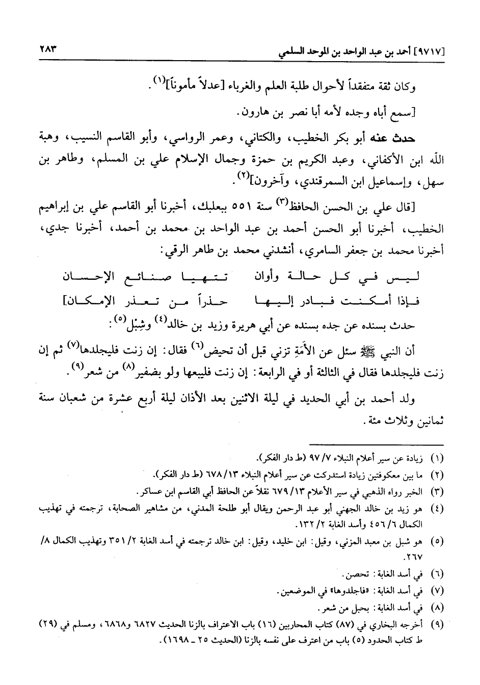 حدث بسنده عن جده بسنده عن أبي هريرة وزيد بن خالد «4» وشبل «5» :
