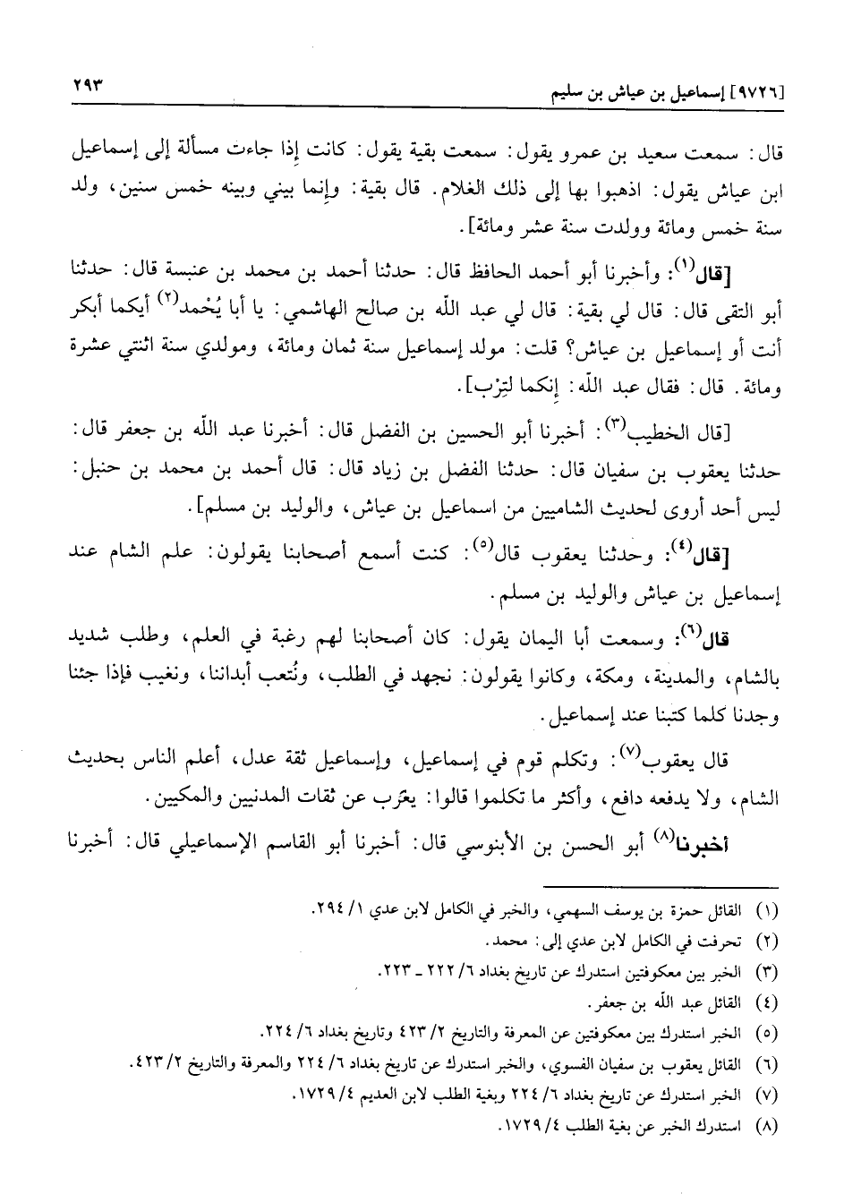 ليس أحد أروى لحديث الشاميين من اسماعيل بن عياش، والوليد بن مسلم] .