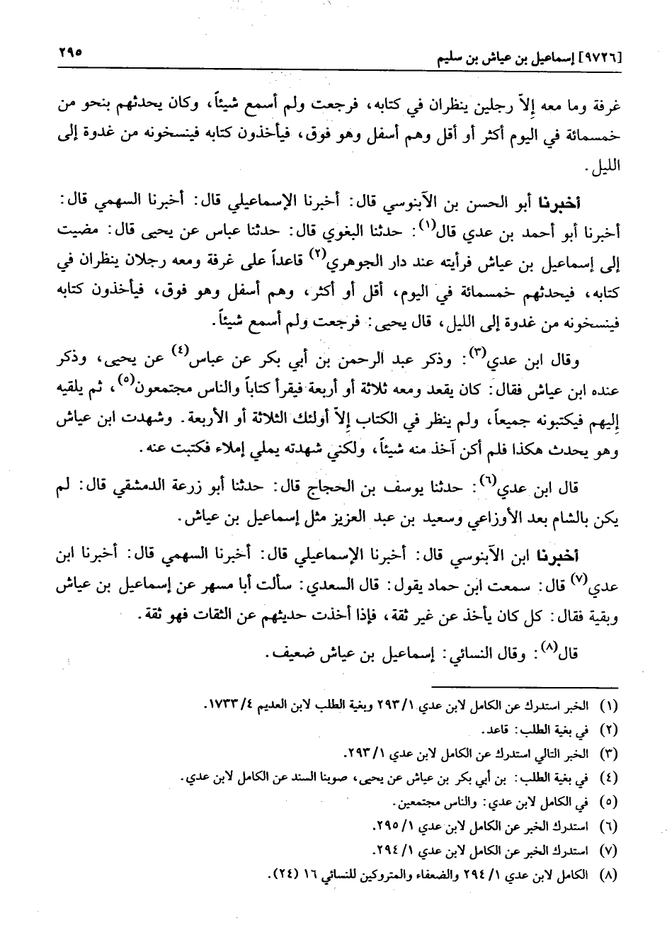 وقال ابن عدي «3» : وذكر عبد الرحمن بن أبي بكر عن عباس «4» عن يحيى، وذكر عنده ابن عياش فقال: كان يقعد ومعه ثلاثة أو أربعة فيقرأ كتابا والناس مجتمعون «5» ، ثم يلقيه إليهم فيكتبونه جميعا، ولم ينظر في الكتاب إلّا أولئك الثلاثة أو الأربعة. وشهدت ابن عياش وهو يحدث هكذا فلم أكن آخذ منه شيئا، ولكني شهدته يملي إملاء فكتبت عنه.