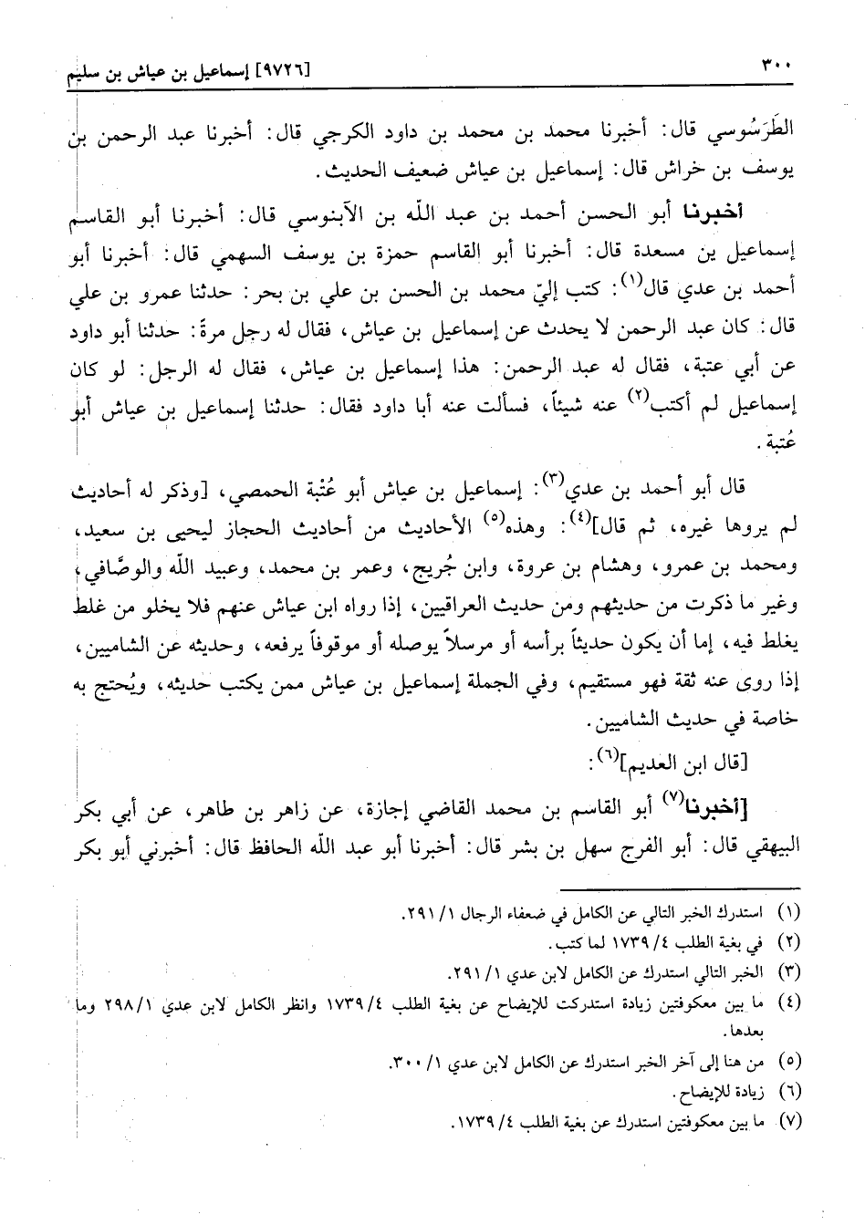 أخبرنا أبو الحسن أحمد بن عبد الله بن الآبنوسي قال: أخبرنا أبو القاسم إسماعيل بن مسعدة قال: أخبرنا أبو القاسم حمزة بن يوسف السهمي قال: أخبرنا أبو أحمد بن عدي قال «1» : كتب إليّ محمد بن الحسن بن علي بن بحر: حدثنا عمرو بن علي قال: كان عبد الرحمن لا يحدث عن إسماعيل بن عياش، فقال له رجل مرة: حدثنا أبو داود عن أبي عتبة، فقال له عبد الرحمن: هذا إسماعيل بن عياش، فقال له الرجل: لو كان إسماعيل لم أكتب «2» عنه شيئا، فسألت عنه أبا داود فقال: حدثنا إسماعيل بن عياش أبو عتبة. قال أبو أحمد بن عدي «3» : إسماعيل بن عياش أبو عتبة الحمصي، [وذكر له أحاديث لم يروها غيره، ثم قال] «4» : وهذه «5» الأحاديث من أحاديث الحجاز ليحيى بن سعيد، ومحمد بن عمرو، وهشام بن عروة، وابن جريج، وعمر بن محمد، وعبيد الله والوصّافي، وغير ما ذكرت من حديثهم ومن حديث العراقيين، إذا رواه ابن عياش عنهم فلا يخلو من غلط يغلط فيه، إما أن يكون حديثا برأسه أو مرسلا يوصله أو موقوفا يرفعه، وحديثه عن الشاميين، إذا روى عنه ثقة فهو مستقيم، وفي الجملة إسماعيل بن عياش ممن يكتب حديثه، ويحتج به خاصة في حديث الشاميين.