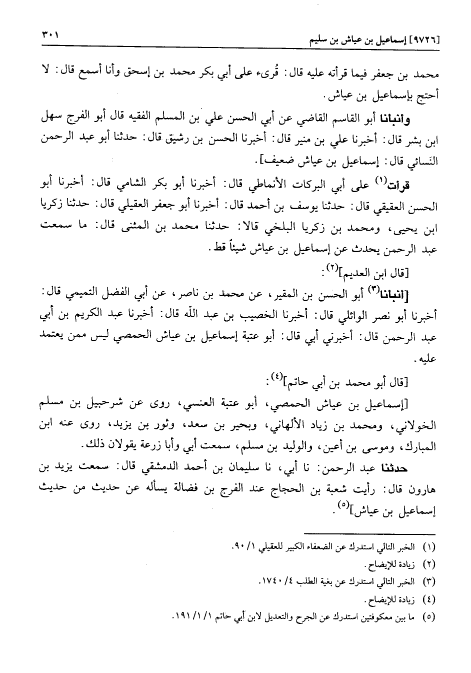 حدثنا عبد الرحمن: نا أبي، نا سليمان بن أحمد الدمشقي قال: سمعت يزيد بن هارون قال: رأيت شعبة بن الحجاج عند الفرج بن فضالة يسأله عن حديث من حديث إسماعيل بن عياش] «5» .