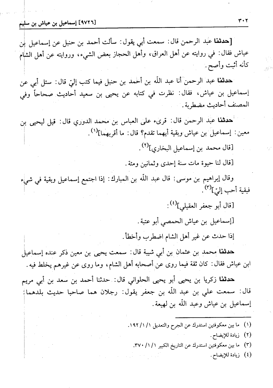 [حدثنا عبد الرحمن قال: سمعت أبي يقول: سألت أحمد بن حنبل عن إسماعيل بن عياش فقال: في روايته عن أهل العراق، وأهل الحجاز بعض الشيء، وروايته عن أهل الشام كأنه أثبت وأصح. حدثنا عبد الرحمن أنا عبد الله بن أحمد بن حنبل فيما كتب إليّ قال: سئل أبي عن إسماعيل بن عياش، فقال: نظرت في كتابه عن يحيى بن سعيد أحاديث صحاحا وفي المصنف أحاديث مضطربة.