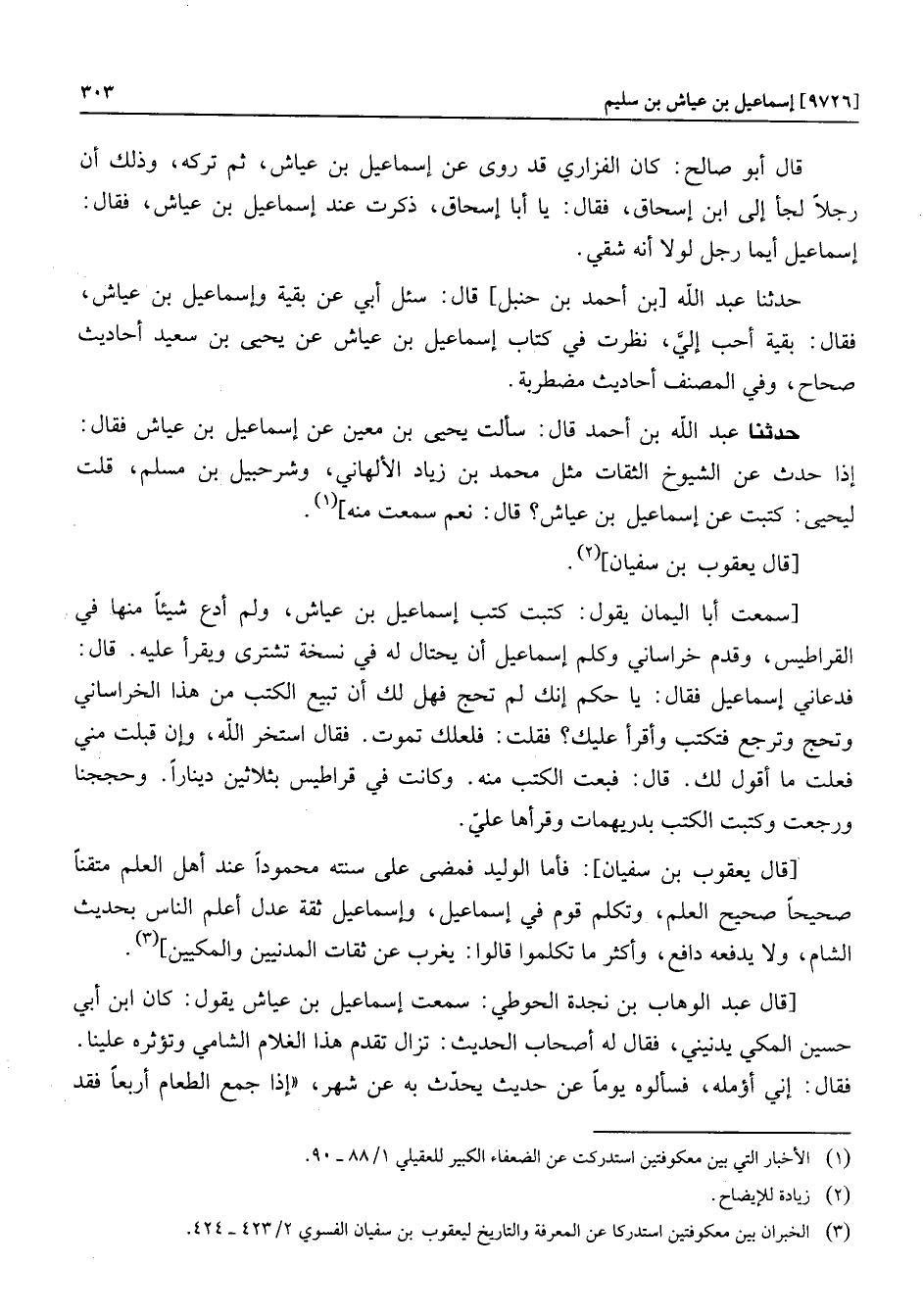[قال يعقوب بن سفيان] : فأما الوليد فمضى على سنته محمودا عند أهل العلم متقنا صحيحا صحيح العلم، وتكلم قوم في إسماعيل، وإسماعيل ثقة عدل أعلم الناس بحديث الشام، ولا يدفعه دافع، وأكثر ما تكلموا قالوا: يغرب عن ثقات المدنيين والمكيين] «3» .