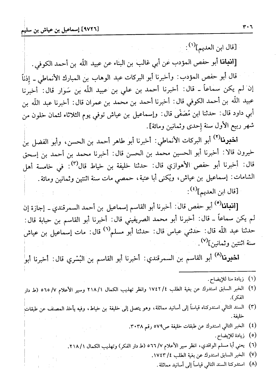 أخبرنا «2» أبو البركات الأنماطي: أخبرنا أبو طاهر أحمد بن الحسن، وأبو الفضل بن خيرون قالا: أخبرنا أبو الحسين محمد بن الحسن قال: أخبرنا محمد بن أحمد بن إسحق قال: أخبرنا أبو حفص الأهوازي قال: حدثنا خليفة بن خياط قال «3» : في خامسة أهل الشامات: إسماعيل بن عياش، ويكنى أبا عتبة، حمصي مات سنة اثنتين وثمانين ومائة.