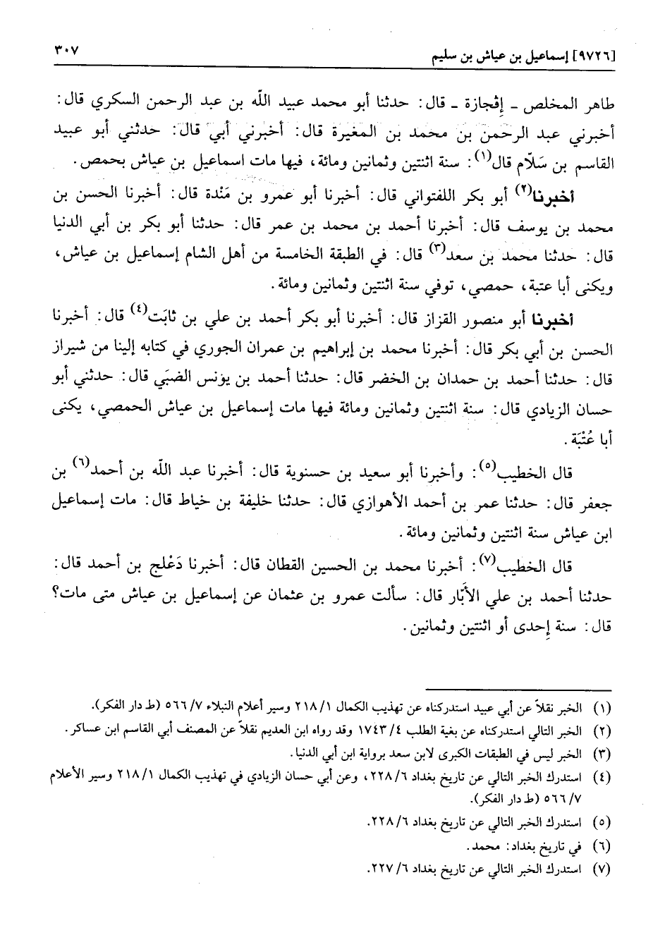 حدثنا أحمد بن علي الأبّار قال: سألت عمرو بن عثمان عن إسماعيل بن عياش متى مات؟