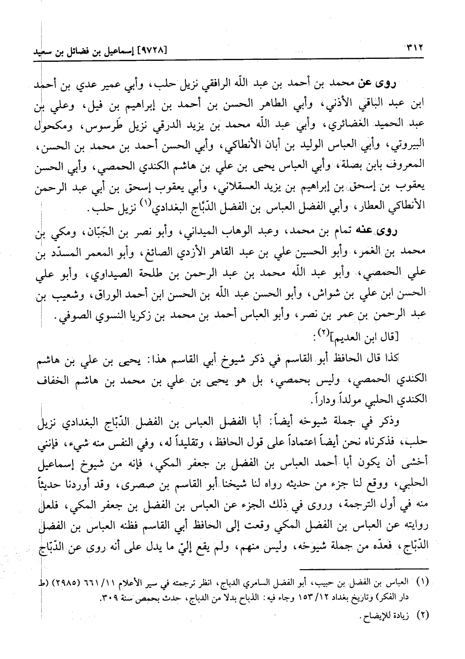 وذكر في جملة شيوخه أيضا: أبا الفضل العباس بن الفضل الدّبّاج البغدادي نزيل حلب، فذكرناه نحن أيضا اعتمادا على قول الحافظ، وتقليدا له، وفي النفس منه شيء، فإنني أخشى أن يكون أبا أحمد العباس بن الفضل بن جعفر المكي، فإنه من شيوخ إسماعيل الحلبي، ووقع لنا جزء من حديثه رواه لنا شيخنا أبو القاسم بن صصرى، وقد أوردنا حديثا منه في أول الترجمة، وروى في ذلك الجزء عن العباس بن الفضل بن جعفر المكي، فلعل روايته عن العباس بن الفضل المكي وقعت إلى الحافظ أبي القاسم فظنه العباس بن الفضل الدّبّاج، فعدّه من جملة شيوخه، وليس منهم، ولم يقع إليّ ما يدل على أنه روى عن الدّبّاج