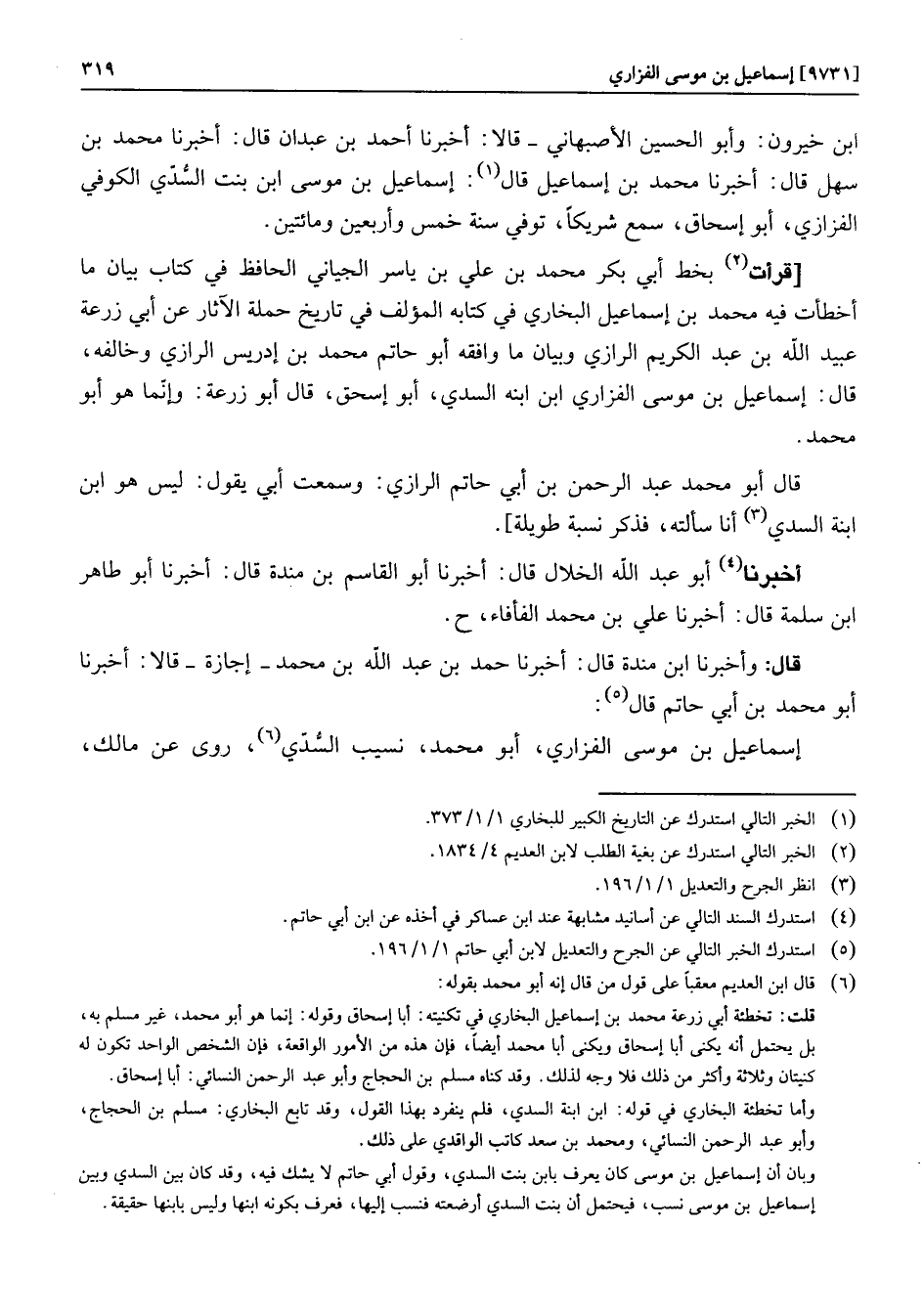 [قرأت «2» بخط أبي بكر محمد بن علي بن ياسر الجياني الحافظ في كتاب بيان ما أخطأت فيه محمد بن إسماعيل البخاري في كتابه المؤلف في تاريخ حملة الآثار عن أبي زرعة عبيد الله بن عبد الكريم الرازي وبيان ما وافقه أبو حاتم محمد بن إدريس الرازي وخالفه، قال: إسماعيل بن موسى الفزاري ابن ابنه السدي، أبو إسحق، قال أبو زرعة: وإنّما هو أبو محمد.