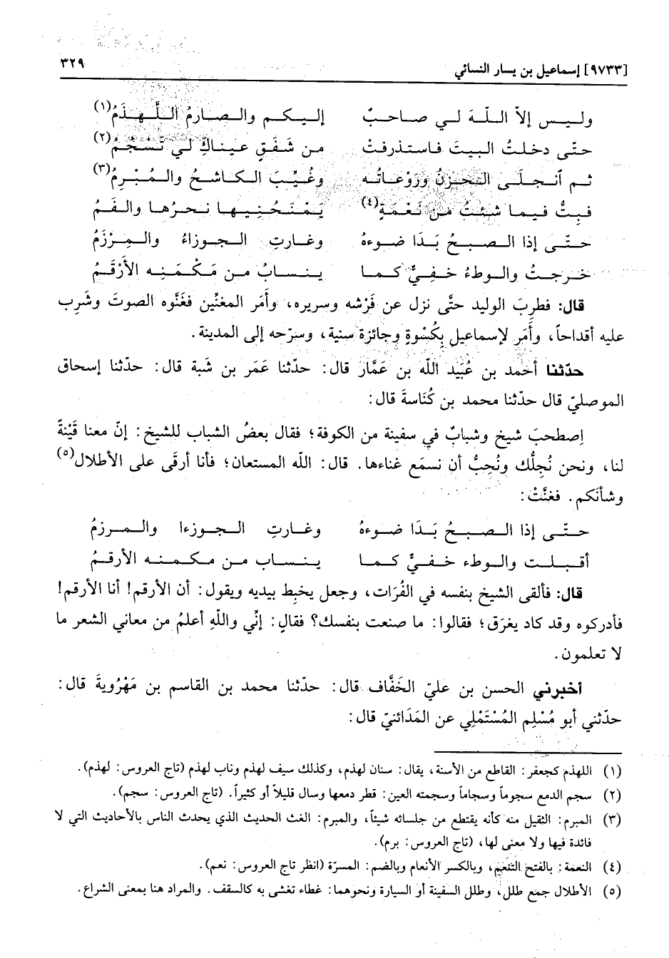 حدّثنا أحمد بن عبيد الله بن عمّار قال: حدّثنا عمر بن شبة قال: حدّثنا إسحاق الموصليّ قال حدّثنا محمد بن كناسة قال:
