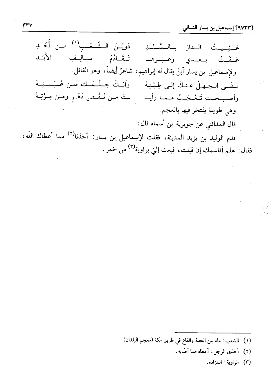 قدم الوليد بن يزيد المدينة، فقلت لإسماعيل بن يسار: أخذنا «2» مما أعطاك الله، فقال: هلم أقاسمك إن قبلت، فبعث إليّ براوية «3» من خمر.