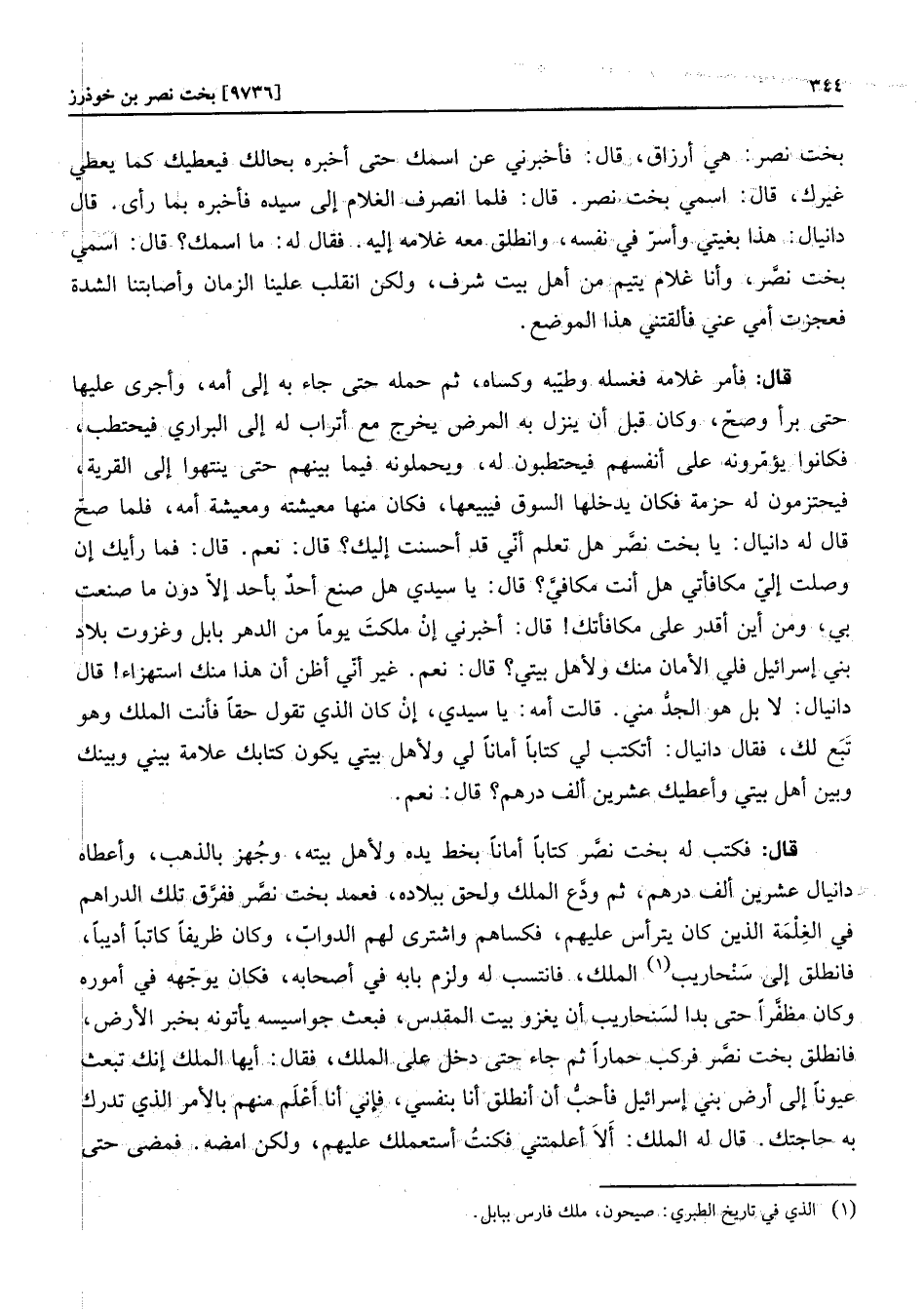 بخت نصر: هي أرزاق، قال: فأخبرني عن اسمك حتى أخبره بحالك فيعطيك كما يعطي غيرك، قال: اسمي بخت نصر. قال: فلما انصرف الغلام إلى سيده فأخبره بما رأى. قال دانيال: هذا بغيتي وأسرّ في نفسه، وانطلق معه غلامه إليه. فقال له: ما اسمك؟ قال: اسمي بخت نصّر، وأنا غلام يتيم من أهل بيت شرف، ولكن انقلب علينا الزمان وأصابتنا الشدة فعجزت أمي عني فألقتني هذا الموضع. قال: فأمر غلامه فغسله وطيّبه وكساه، ثم حمله حتى جاء به إلى أمه، وأجرى عليها حتى برأ وصحّ، وكان قبل أن ينزل به المرض يخرج مع أتراب له إلى البراري فيحتطب، فكانوا يؤمّرونه على أنفسهم فيحتطبون له، ويحملونه فيما بينهم حتى ينتهوا إلى القرية، فيحتزمون له حزمة فكان يدخلها السوق فيبيعها، فكان منها معيشته ومعيشة أمه، فلما صحّ قال له دانيال: يا بخت نصّر هل تعلم أنّي قد أحسنت إليك؟ قال: نعم. قال: فما رأيك إن وصلت إليّ مكافأتي هل أنت مكافيّ؟ قال: يا سيدي هل صنع أحد بأحد إلّا دون ما صنعت بي، ومن أين أقدر على مكافأتك! قال: أخبرني إن ملكت يوما من الدهر بابل وغزوت بلاد بني إسرائيل فلي الأمان منك ولأهل بيتي؟ قال: نعم. غير أنّي أظن أن هذا منك استهزاء! قال دانيال: لا بل هو الجدّ مني. قالت أمه: يا سيدي، إن كان الذي تقول حقا فأنت الملك وهو تبع لك، فقال دانيال: أتكتب لي كتابا أمانا لي ولأهل بيتي يكون كتابك علامة بيني وبينك وبين أهل بيتي وأعطيك عشرين ألف درهم؟ قال: نعم. قال: فكتب له بخت نصّر كتابا أمانا بخط يده ولأهل بيته، وجهز بالذهب، وأعطاه دانيال عشرين ألف درهم، ثم ودّع الملك ولحق ببلاده، فعمد بخت نصّر ففرّق تلك الدراهم في الغلمة الذين كان يترأس عليهم، فكساهم واشترى لهم الدوابّ، وكان ظريفا كاتبا أديبا، فانطلق إلى سنحاريب «1» الملك، فانتسب له ولزم بابه في أصحابه، فكان يوجّهه في أموره وكان مظفّرا حتى بدا لسنحاريب أن يغزو بيت المقدس، فبعث جواسيسه يأتونه بخبر الأرض، فانطلق بخت نصّر فركب حمارا ثم جاء حتى دخل على الملك، فقال: أيها الملك إنك تبعث عيونا إلى أرض بني إسرائيل فأحبّ أن أنطلق أنا بنفسي، فإني أنا أعلم منهم بالأمر الذي تدرك به حاجتك. قال له الملك: ألا أعلمتني فكنت أستعملك عليهم، ولكن امضه. فمضى حتى