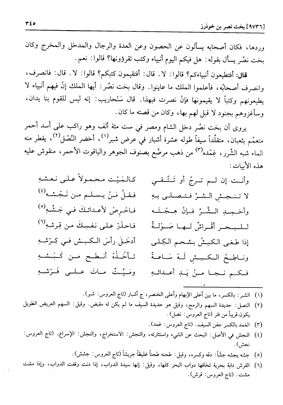 يروى أن بخت نصّر دخل الشام ومصر في ست مئة ألف وهو راكب على أسد أحمر متعمّم بثعبان، متقلّدا سيفا طوله عشرة أشبار في عرض شبر «1» ، أخضر النّصل «2» ، يقطر منه الماء شبه الشّرر، غمده «3» من ذهب مرصّع بصنوف الجوهر والياقوت الأحمر، منقوش عليه هذه الأبيات: