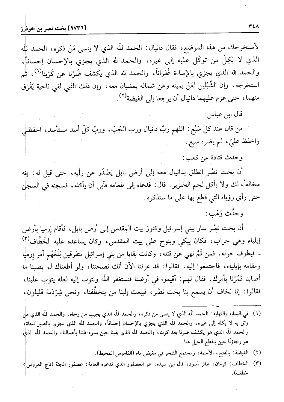 لأستخرجك من هذا الموضع، فقال دانيال: الحمد لله الذي لا ينسى من ذكره، الحمد لله الذي لا يكل من توكّل عليه إلى غيره، والحمد لله الذي يجزي بالإحسان إحسانا، والحمد لله الذي يجزي بالإساءة غفرانا، والحمد لله الذي يكشف ضرّنا عن كربنا «1» ، ثم استخرجه، وإن الشّبلين لعن يمينه وعن شماله يمشيان معه، وإن ذلك النّبي لفي ناحية يفرق منهما، حتى عزم عليهما دانيال أن يرجعا إلى الغيضة «2» .