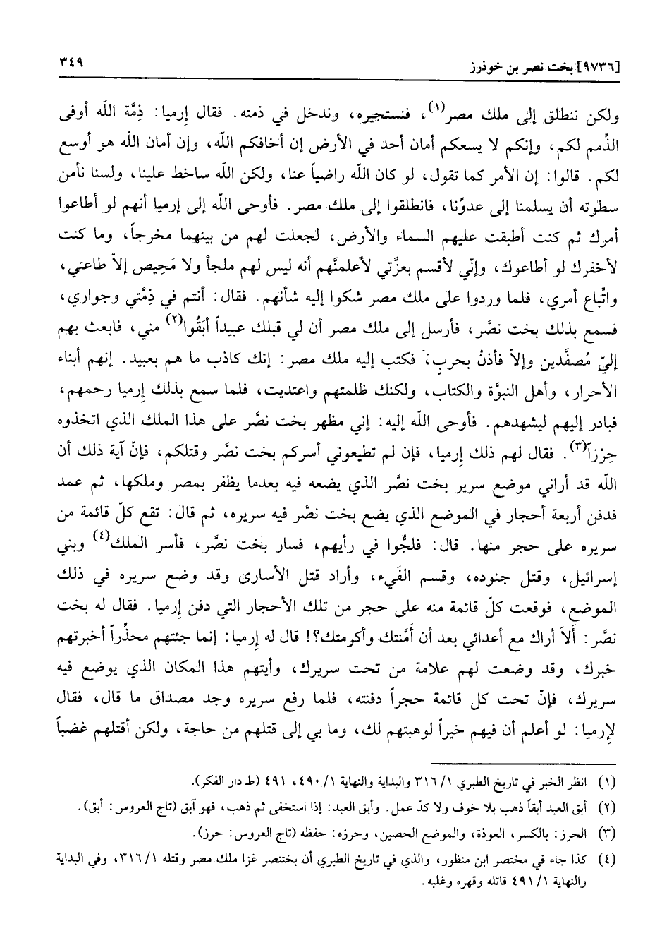 ولكن ننطلق إلى ملك مصر «1» ، فنستجيره، وندخل في ذمته. فقال إرميا: ذمّة الله أوفى الذّمم لكم، وإنكم لا يسعكم أمان أحد في الأرض إن أخافكم الله، وإن أمان الله هو أوسع لكم. قالوا: إن الأمر كما تقول، لو كان الله راضيا عنا، ولكن الله ساخط علينا، ولسنا نأمن سطوته أن يسلمنا إلى عدوّنا، فانطلقوا إلى ملك مصر. فأوحى الله إلى إرميا أنهم لو أطاعوا أمرك ثم كنت أطبقت عليهم السماء والأرض، لجعلت لهم من بينهما مخرجا، وما كنت لأخفرك لو أطاعوك، وإنّي لأقسم بعزّتي لأعلمنّهم أنه ليس لهم ملجأ ولا محيص إلّا طاعتي، واتّباع أمري، فلما وردوا على ملك مصر شكوا إليه شأنهم. فقال: أنتم في ذمّتي وجواري، فسمع بذلك بخت نصّر، فأرسل إلى ملك مصر أن لي قبلك عبيدا أبقوا «2» مني، فابعث بهم إليّ مصفّدين وإلّا فأذن بحرب، فكتب إليه ملك مصر: إنك كاذب ما هم بعبيد. إنهم أبناء الأحرار، وأهل النبوّة والكتاب، ولكنك ظلمتهم واعتديت، فلما سمع بذلك إرميا رحمهم، فبادر إليهم ليشهدهم. فأوحى الله إليه: إني مظهر بخت نصّر على هذا الملك الذي اتخذوه حرزا «3» . فقال لهم ذلك إرميا، فإن لم تطيعوني أسركم بخت نصّر وقتلكم، فإنّ آية ذلك أن الله قد أراني موضع سرير بخت نصّر الذي يضعه فيه بعد ما يظفر بمصر وملكها، ثم عمد فدفن أربعة أحجاز في الموضع الذي يضع بخت نصّر فيه سريره، ثم قال: تقع كلّ قائمة من سريره على حجر منها. قال: فلجّوا في رأيهم، فسار بخت نصّر، فأسر الملك «4» وبني إسرائيل، وقتل جنوده، وقسم الفيء، وأراد قتل الأسارى وقد وضع سريره في ذلك الموضع، فوقعت كلّ قائمة منه على حجر من تلك الأحجار التي دفن إرميا. فقال له بخت نصّر: ألا أراك مع أعدائي بعد أن أمّنتك وأكرمتك؟! قال له إرميا: إنما جئتهم محذّرا أخبرتهم خبرك، وقد وضعت لهم علامة من تحت سريرك، وأيتهم هذا المكان الذي يوضع فيه سريرك، فإنّ تحت كل قائمة حجرا دفنته، فلما رفع سريره وجد مصداق ما قال، فقال لإرميا: لو أعلم أن فيهم خيرا لوهبتهم لك، وما بي إلى قتلهم من حاجة، ولكن أقتلهم غضبا