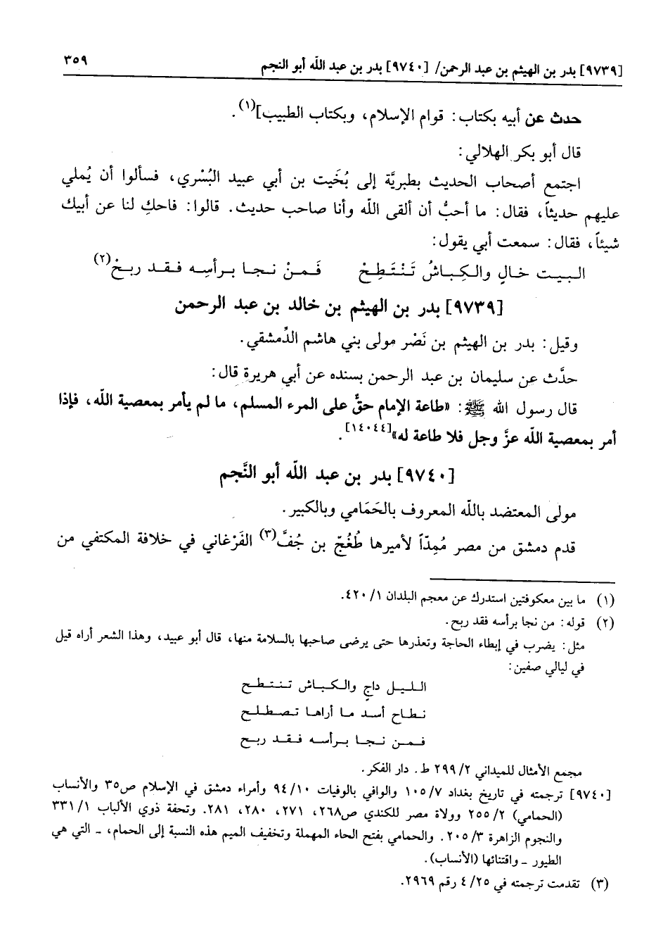 [9740] ترجمته في تاريخ بغداد 7/105 والوافي بالوفيات 10/94 وأمراء دمشق في الإسلام ص 35 والأنساب (الحمامي) 2/255 وولاة مصر للكندي ص 268، 271، 280، 281. وتحفة ذوي الألباب 1/331 والنجوم الزاهرة 3/205. والحمامي بفتح الحاء المهملة وتخفيف الميم هذه النسبة إلى الحمام، - التي هي الطيور- واقتنائها (الأنساب) .