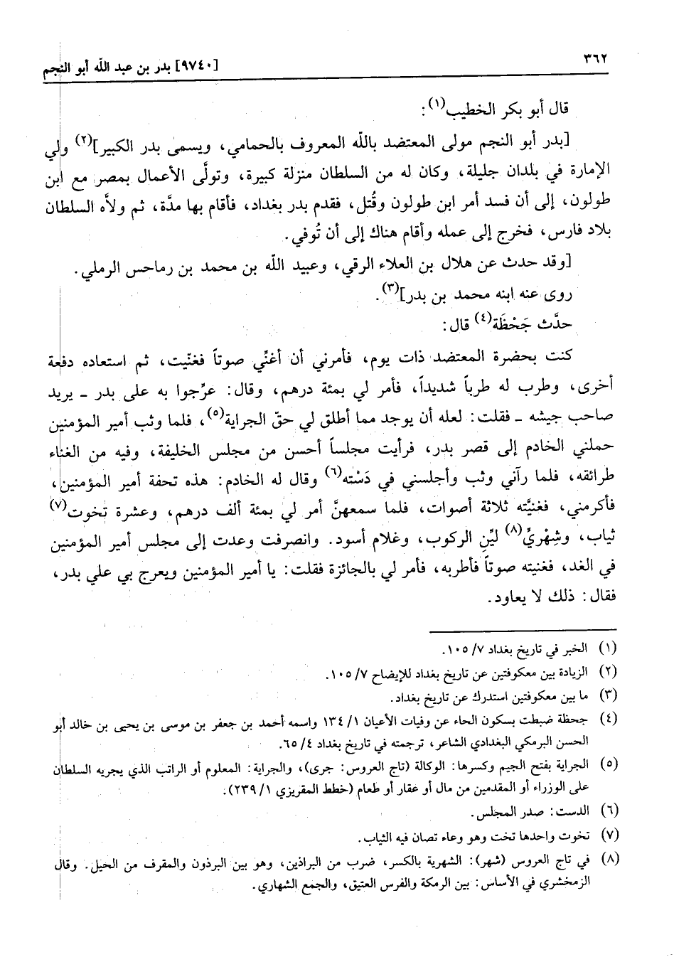 [بدر أبو النجم مولى المعتضد بالله المعروف بالحمامي، ويسمى بدر الكبير] «2» ولي الإمارة في بلدان جليلة، وكان له من السلطان منزلة كبيرة، وتولّى الأعمال بمصر مع ابن طولون، إلى أن فسد أمر ابن طولون وقتل، فقدم بدر بغداد، فأقام بها مدّة، ثم ولّاه السلطان بلاد فارس، فخرج إلى عمله وأقام هناك إلى أن توفي. [وقد حدث عن هلال بن العلاء الرقي، وعبيد الله بن محمد بن رماحس الرملي.