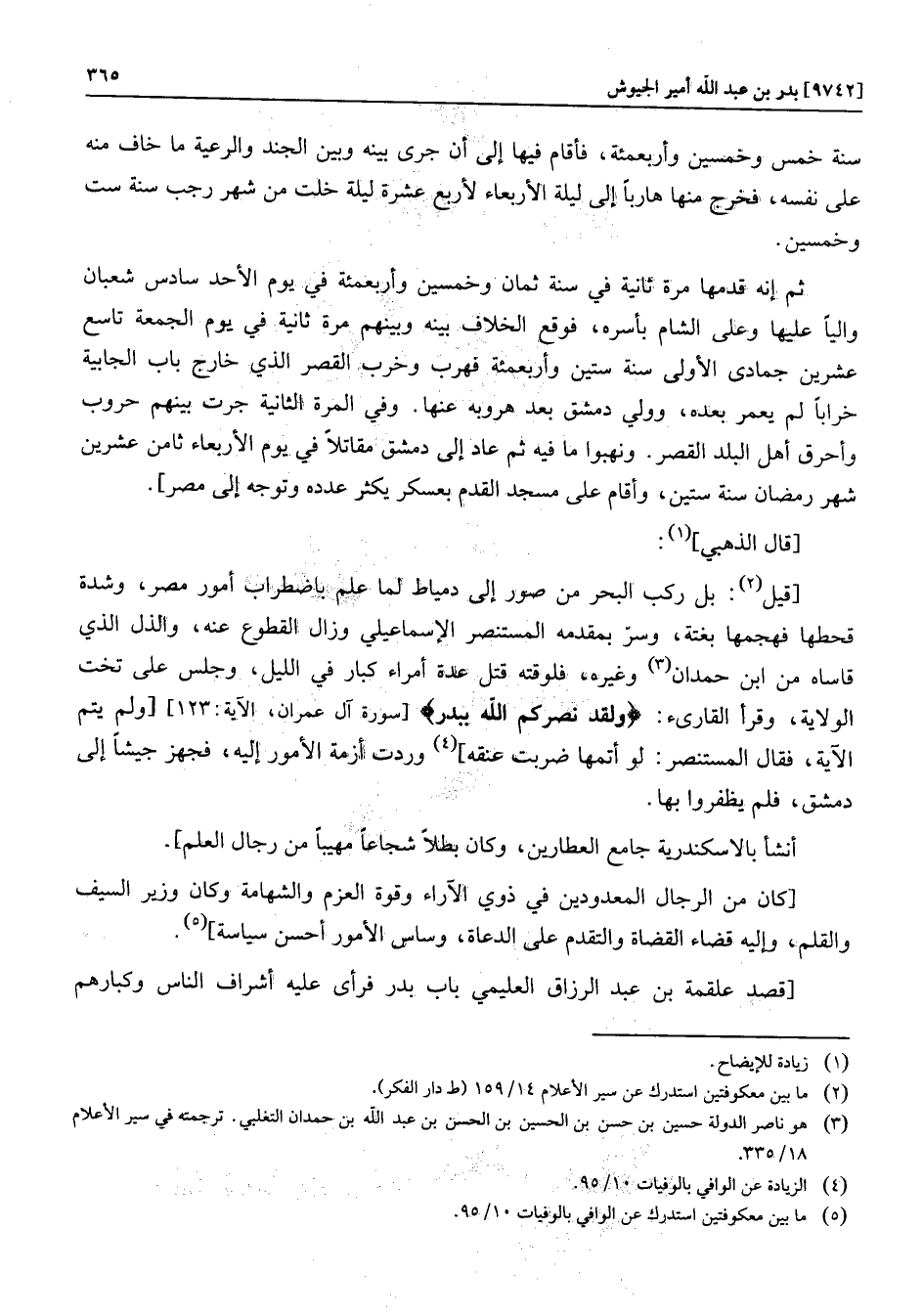[قيل «2» : بل ركب البحر من صور إلى دمياط لما علم باضطراب أمور مصر، وشدة قحطها فهجمها بغتة، وسرّ بمقدمه المستنصر الإسماعيلي وزال القطوع عنه، والذل الذي قاساه من ابن حمدان «3» وغيره، فلوقته قتل عدة أمراء كبار في الليل، وجلس على تخت الولاية، وقرأ القارىء: وَلَقَدْ نَصَرَكُمُ اللَّهُ بِبَدْرٍ