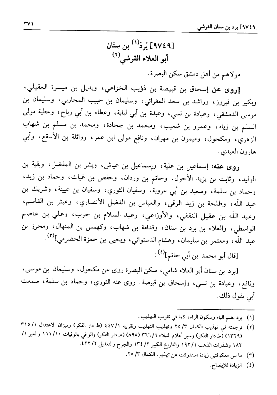 [برد بن سنان أبو العلاء شامي، سكن البصرة روى عن مكحول، وسليمان بن موسى، ونافع، وعبادة بن نسي، وإسحاق بن قبيصة. روى عنه الثوري، وحماد بن سلمة، سمعت أبي يقول ذلك.