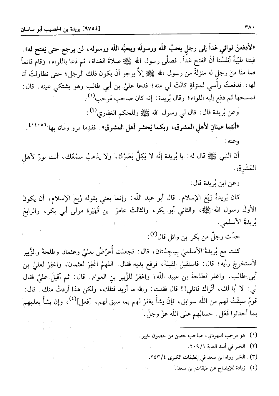 كان بريدة ربع الإسلام. قال أبو عبد الله: وإنما يعني بقوله ربع الإسلام، أن يكون الأول رسول الله صلى الله عليه وسلم، والثاني أبو بكر، والثالث عامر بن فهيرة مولى أبي بكر، والرابع بريدة الأسلمي.