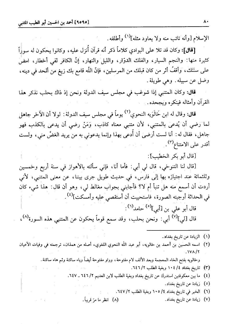 قال: وكان المتنبي إذا شوغب في مجلس سيف الدولة ونحن إذ ذاك بحلب نذكر هذا القرآن وأمثاله فينكره ويجحده. قال: وقال له ابن خالويه النحوي «2» يوما في مجلس سيف الدولة: لولا أن الآخر جاهل لما رضي أن يدعى بالمتنبي، لأن متنبي معناه كاذب، ومن رضي أن يدعى بالكذب فهو جاهل، فقال له: أنا لست أرضى أن أدعى بهذا وإنما يدعوني به من يريد الغضّ مني، ولست أقدر على الامتناع «3» .