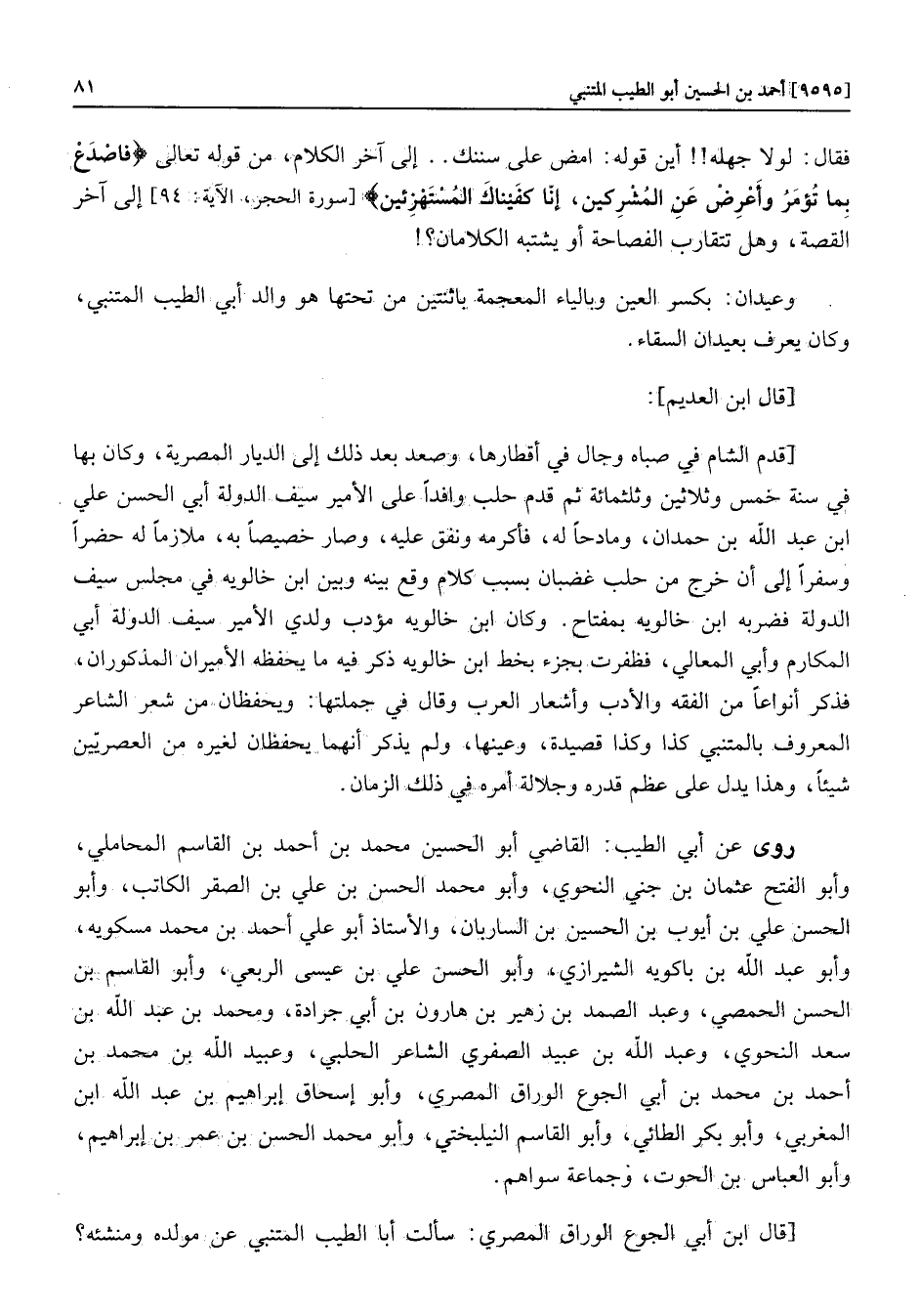 [سورة الحجر، الآية: 94] إلى آخر القصة، وهل تتقارب الفصاحة أو يشتبه الكلامان؟! وعيدان: بكسر العين وبالياء المعجمة باثنتين من تحتها هو والد أبي الطيب المتنبي، وكان يعرف بعيدان السقاء.